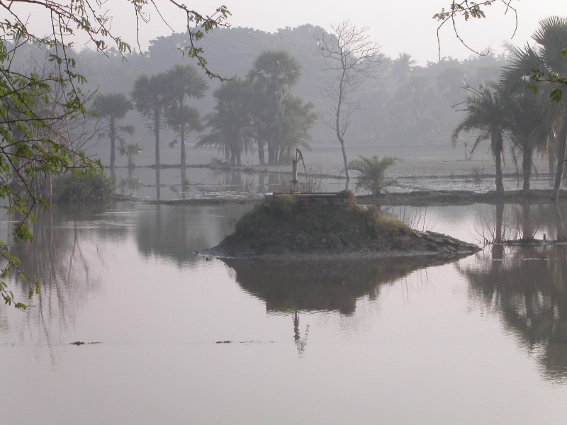 foto: De bus reed zo hard dat ik geen foto heb kunnen maken van een garnalenkwekerij. Dan maar een prachtig plaatje van een zielige waterpomp in een ondergelopen gebied.