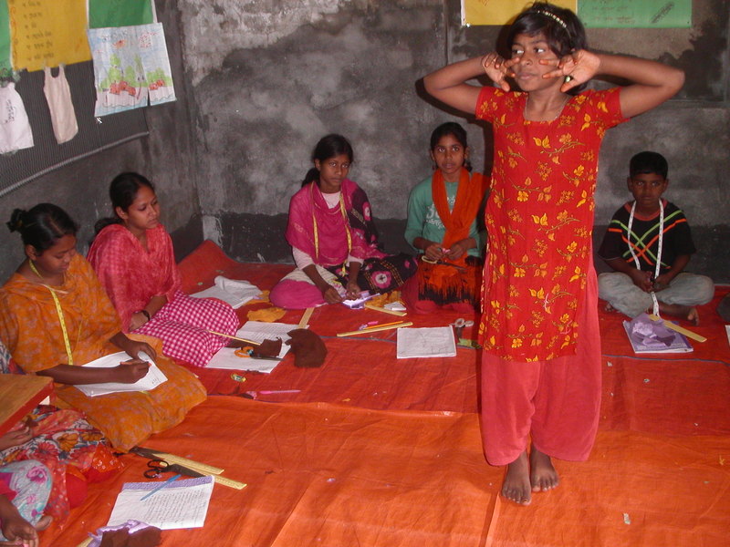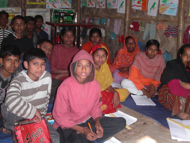e dag mee zoet zijn. In de garnalenkweek verdienen de jongens (meisjes doen dit niet) een paar Euro meer, maar de verhalen over dat werk vond ik nou niet bepaald kindvriendelijk. Kinderen zorgen daar b.v. voor het voeren van de garnalen, waarbij ze uren op kleine bootjes in de waterbassins heen en weer peddelen met slakken als voer zonder dat ze er af mogen. Vaak mogen ze niet weg om naar school te gaan. Het zijn grote bazen in de garnalenkweek, waarvan een ieder hier zegt dat het maffia is. Tijdens mijn bezoek hadden de kinderen les in patroontekenen en naaien. Kleermaker is hier een eervol beroep; daar zijn er heel wat van, maar zo te zien is daar ook overal en altijd behoefte aan. Het geldt als een mooi alternatief voor de toekomst. In elke groep haken wel een paar kinderen af. Uitvoerig wordt gesproken over de reden daarvan en wat er aan te doen is. Een belangrijk deel van het project bestaat dan ook uit het doen van huisbezoeken om kinderen en ouders te motiveren. Ouders vinden het dikwijls niet nodig dat hun kind wat leert. Meisjes haken nogal eens af omdat ze trouwen; in de klasjes die ik bezocht hoorde ik van een meisje van 12 en twee van 14 die om die reden weggebleven waren. Het komt hier echt nog veel voor dat meisjes zo jong worden uitgehuwelijkt. Vreselijk. Officieel mag het niet en is de minimumleeftijd 18.