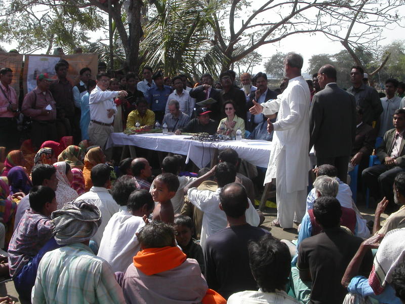 en de resultaten te bekijken van het "Disaster management project". Onderdelen van dit project zijn de drinkwateroplossingen, maar het gaat vooral over de realisatie van zgn plintbouw: voorkomen moet worden dat de huizen snel onder water staan, er worden nu dus huisjes gebouwd op hoog gelegen straten c.q. dijken. Het was allemaal goed voorbereid door Shushilan hoewel het toch echt meer op een goed geregisseerd toneelstukje leek. Het heeft in ieder geval onmiddellijk effect gehad. De dag erop waren er allerlei vergaderingen in Dhaka en er komt geld beschikbaar voor meer van dergelijke programmaas. Achteraf vroegen we ons af of zo’n bezoek niet anders zou kunnen; het kost een bom geld en we vroegen ons af wat de delegatie nou feitelijk ziet tijdens zo’n bliksembezoek van 1 uur. Ik heb dit soort visites al meer meegemaakt en ik blijf het een rare vertoning vinden. Kunnen ze niet beter gewoon met een auto komen…..dan zien ze onderweg ook nog wat…… maar ja dat kost een paar dagen en daar schijnt geen tijd voor te zijn…..