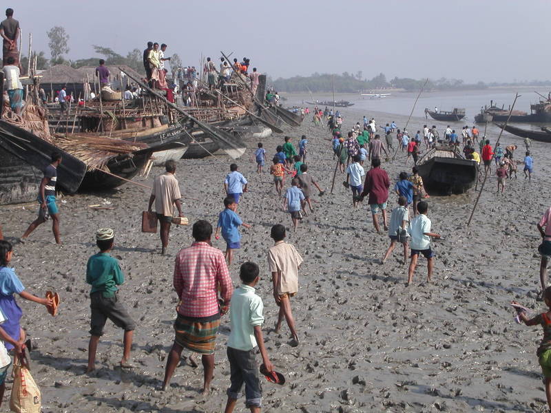 stonden te wachten op de kade, want ze kwamen met een watervliegtuig uit het verre Dhaka! Na de landing renden ze met zijn allen over het diepe modderstrand naar het vliegtuig. Het is een gebied waar geen buitenlander komt en ook ik ben daar een heel bijzondere verschijning. Ik meen een doortastende manier van lopen ontwikkeld te hebben waardoor ik zo min mogelijk last heb van de hordes mensen die op me af komen met eeuwig dezelfde vragen zoals "your name?" en "where come from?" . Maar hier werd het ook mij op een gegeven te gortig. Ik dacht mij te kunnen verschansen in ons busje, maar dat was een misrekening. Ik kreeg het echt even erg benauwd toen de bus heen en weer geschommeld werd door de honderden op de ruiten geplakte neuzen. Meestal ben ik niet onmiddellijk blij als een politieagent te hulp schiet maar dit keer wel. Voor de lokale bevolking ben ik net zo’n VIP als de echte VIP’s.