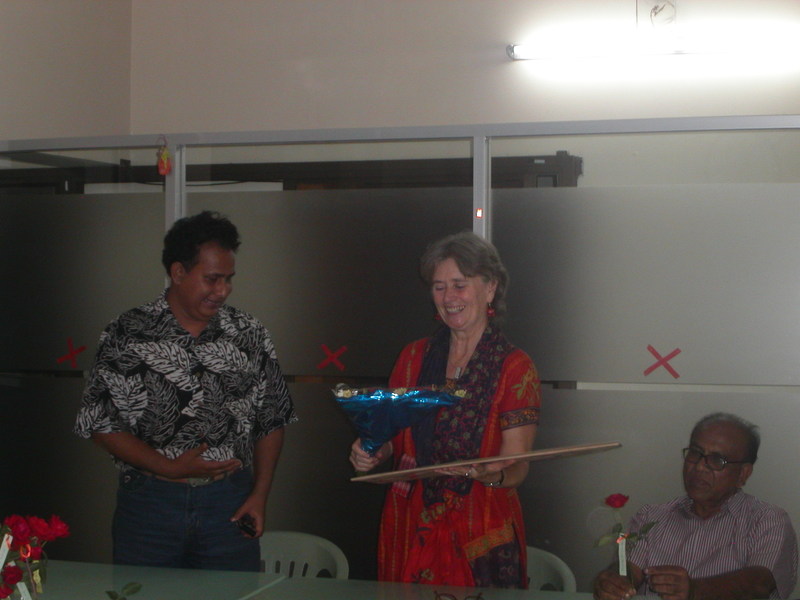 zij hebben zich ook aan mij gehecht. Vooral Mujib, Satu en Sanjoy zal ik nooit meer vergeten. Maar ook de jongens van de bewaking zoals Sadik en Montu, de kokkin Lolita, en de "Shushilan ladies" waren van betekenis voor mij. Alle anderen ga ik niet opnoemen; dat is teveel. Op de laatste dag was er een afscheidsbijeenkomst georganiseerd. Met toespraakjes uiteraard. Allemaal heel hartelijk. Op de een of andere manier heb ik hen een goede ervaring gegeven in het werken met VSO. In de loop van het jaar heb ik vaker moeten aanhoren wat en hoe het met voorgaande VSO’ers niet goed was gegaan. Dat zat hem toch vooral in de relatie-sfeer, naar mijn idee. Ik heb daar, zeker in de beginperiode, heel veel aandacht aan besteed omdat ik weet dat je niks voor elkaar krijgt als er geen vertrouwen is. Ik had contact met iedereen, gedroeg me als één van hen en dat is zeer gewaardeerd. "Hanny is easing going, never upset" werd gememoreerd. Niet iedereen in Ned