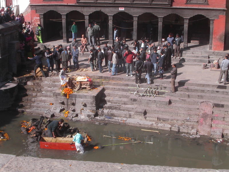 je er niet in. Dat is niet zo erg, want er is buiten genoeg te zien. Een ambulance stopte naast ons en laadde een doodzieke oude vrouw op een brancard uit. Ze werd in een soort hospice neergelegd, waarna de brancard mét het zuurstofapparaat waar de vrouw aan had gelegen, alweer afgevoerd werd. Deze vrouw komt daar om dood te gaan. De tempel ligt aan de rivier, waar rituele wasplaatsen zijn en lijkverbrandingen plaats vinden. Wij kwamen er op het juiste moment en konden een heel ritueel van lijkverbranding gade slaan. Ik vond het een confronterend proces; vooral omdat alles zo open en niets verhullend plaats vindt. Als je bij ons een crematie meemaakt is dat toch een tamelijk kil en clean gebeuren.