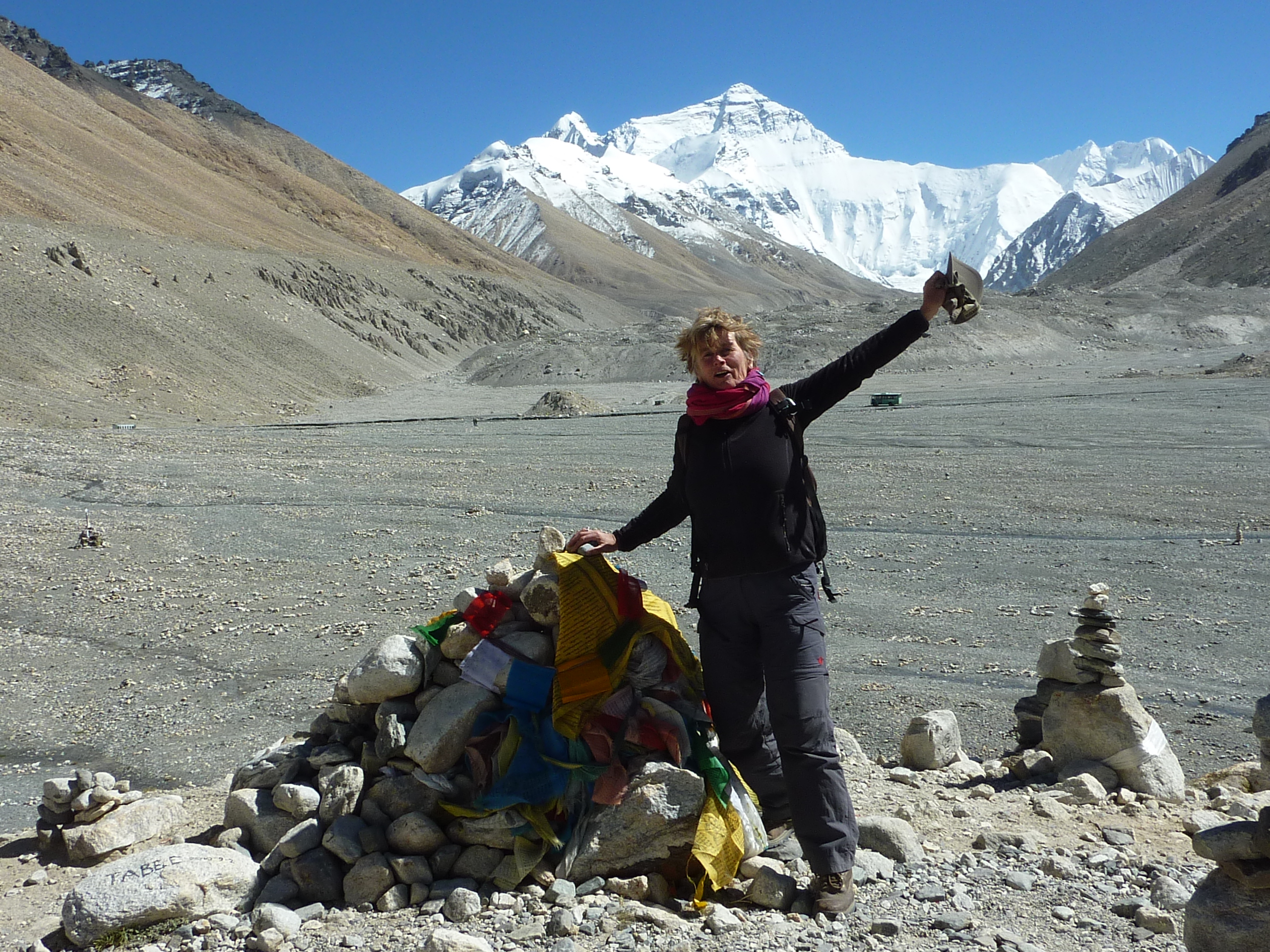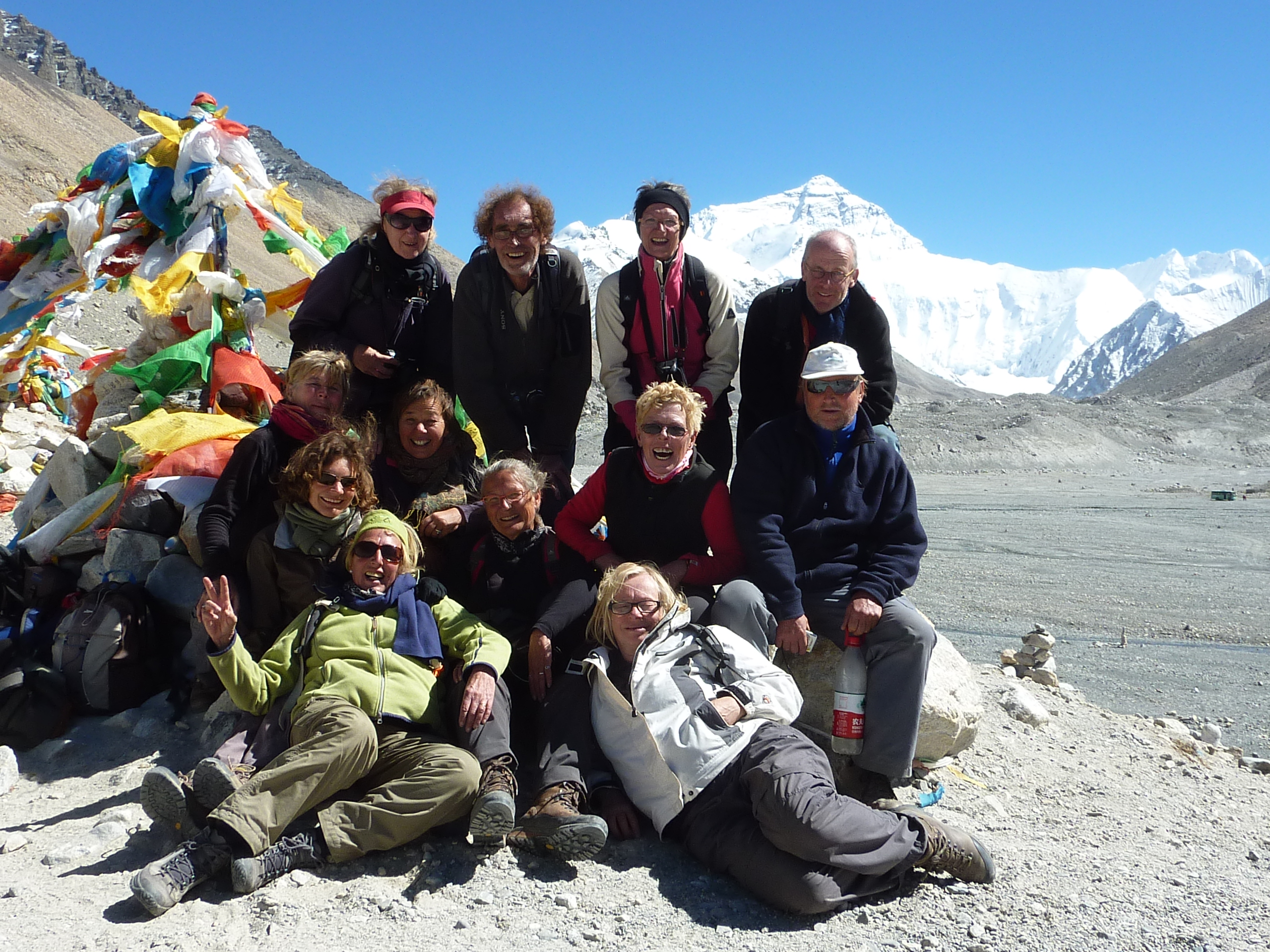 Deze week zijn we op de Mount Everest geweest. 8848 m hoog. Niet op de top welverstaan, maar bij het basiskamp, van waaruit de echte bergbeklimmers vertrekken. Hoog genoeg voor ons. Jammergenoeg zat er geen trekking in, omdat we nogal wat tijd verloren hadden met onze auto-problemen. Vanuit Tingri dachten we even op en neer te gaan met de twee jeeps, die op dat moment zonder panne waren. We propten ons er met zijn allen in. Dat was een kleine vergissing in de afstand. Het kostte ons 4 uur om over het indrukwekkende, doch zeer stenige landschap, het tentenkamp van de mount Everest te bereiken. Heel leuk om daar even te zijn en wat fotoos te nemen. Maar qua ervaring haalde het niet bij mijn eigen" bereiken van de top" van de Mount Kailash. Daarna was het weer 4 uur terug hobbelen.