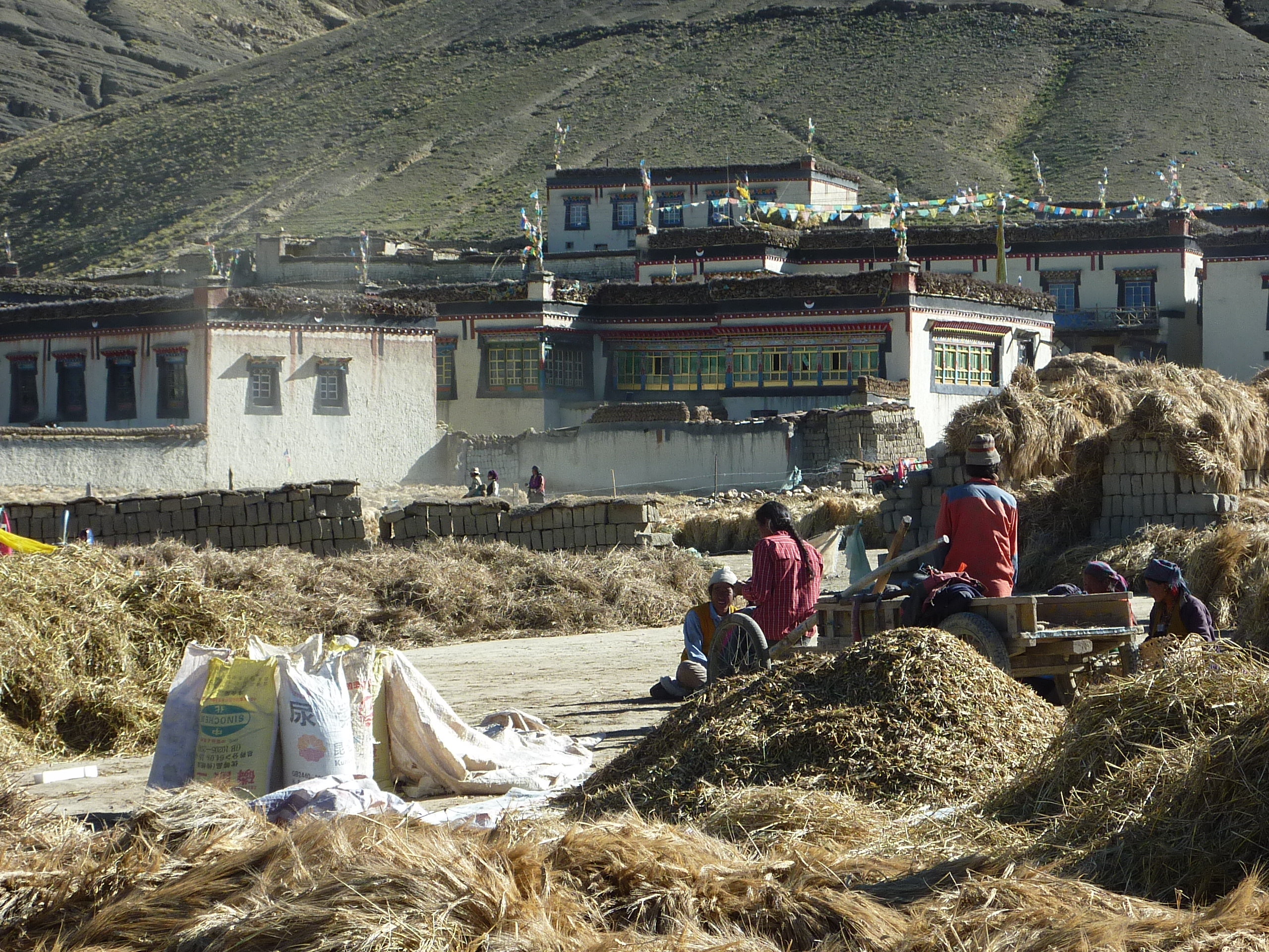 stuitend. Het is kolonialisme van het ouderwetse soort. We hebben veel wegwerkzaamheden gezien. Ik denk dat je over 5 jaar heel Tibet als over een snelweg kunt gaan bezoeken. Nu zie je her en der groepen Tibetanen met een schop en de hand aan wegen werken terwijl chinese opzichter en met de handen in de zak bij staan te bevelen. Het zit er dik in dat over enige tijd meer Chinezen in Tibet wonen dan Tibetanen. Ze worden dan als vanzelf een minderheid. De chinese cultuur overheerst nu al in bepaalde plaatsen zoals b.v. in Ali in het westen van het land. Dat is een grensplaats (met India) en er zitten heel veel militairen, met alle (niet positieve) invloeden van dien. Tibetanen zijn heel devoot en toegewijd; chinezen zijn grof en dominant. Ik weet dat het een generalisatie is, maar toch zag ik het steeds weer. Echte Tibetaanse dorpjes zijn prachtig: vierkante lage huizen met