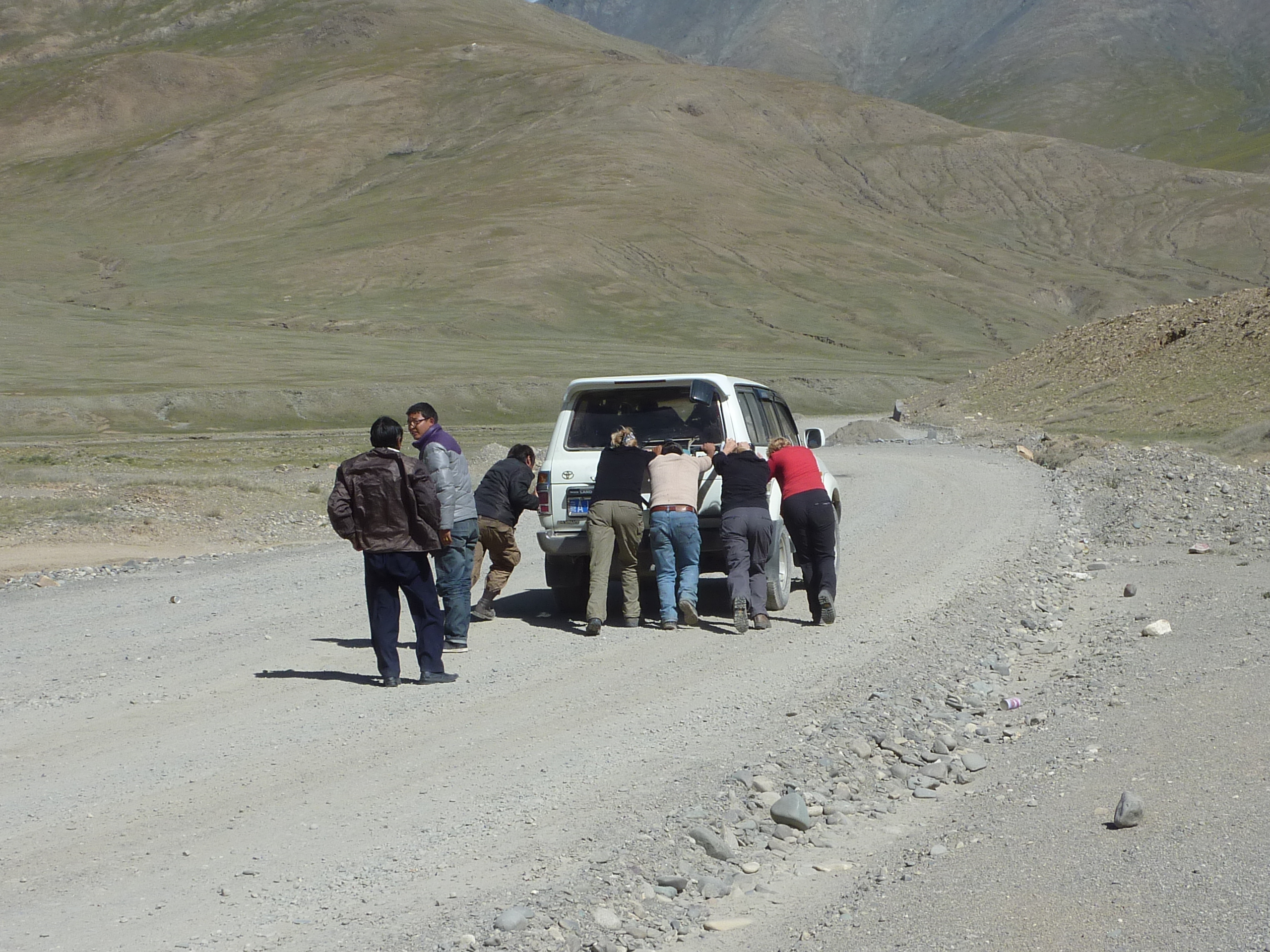 kortademigheid bij de geringste inspanning (bukken om je schoenveters vast te maken maakt je al buiten adem) en sommige hadden problemen met slapen vanwege luchtgebrek. Ik vind dat mijn conditie het goed gehouden heeft. Met 3 Toyota jeeps hebben we een paar duizend kilometer afgelegd door het ruige ontoegankelijke noord westen en zuiden (route: vanaf Lhasa westwaarts naar Raka, dan noordwaarts via Tsochen,