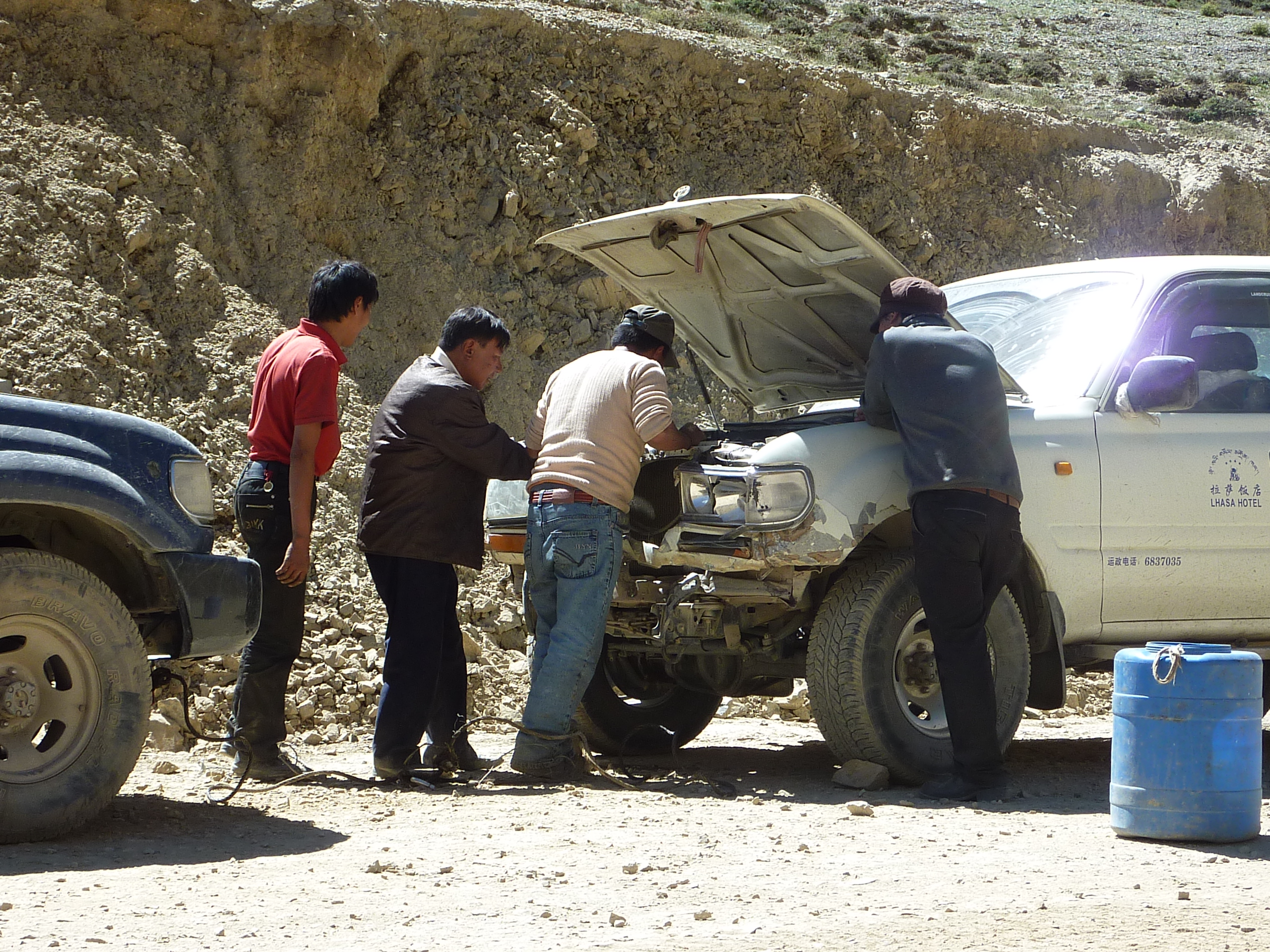 de auto's en de groep. Gelukkig zijn Tibetaanse chauffeurs niet voor een gat te vangen. Met veel