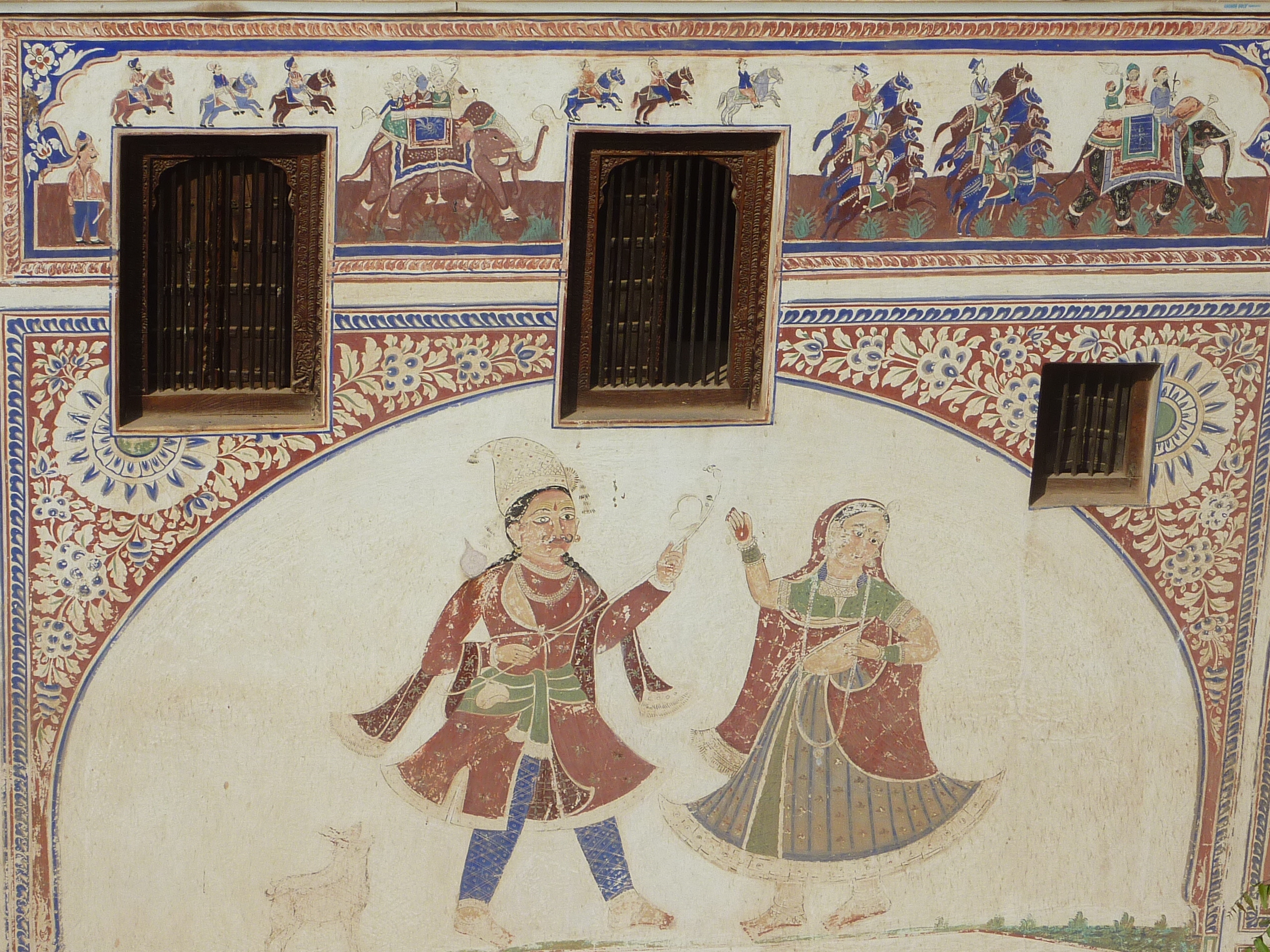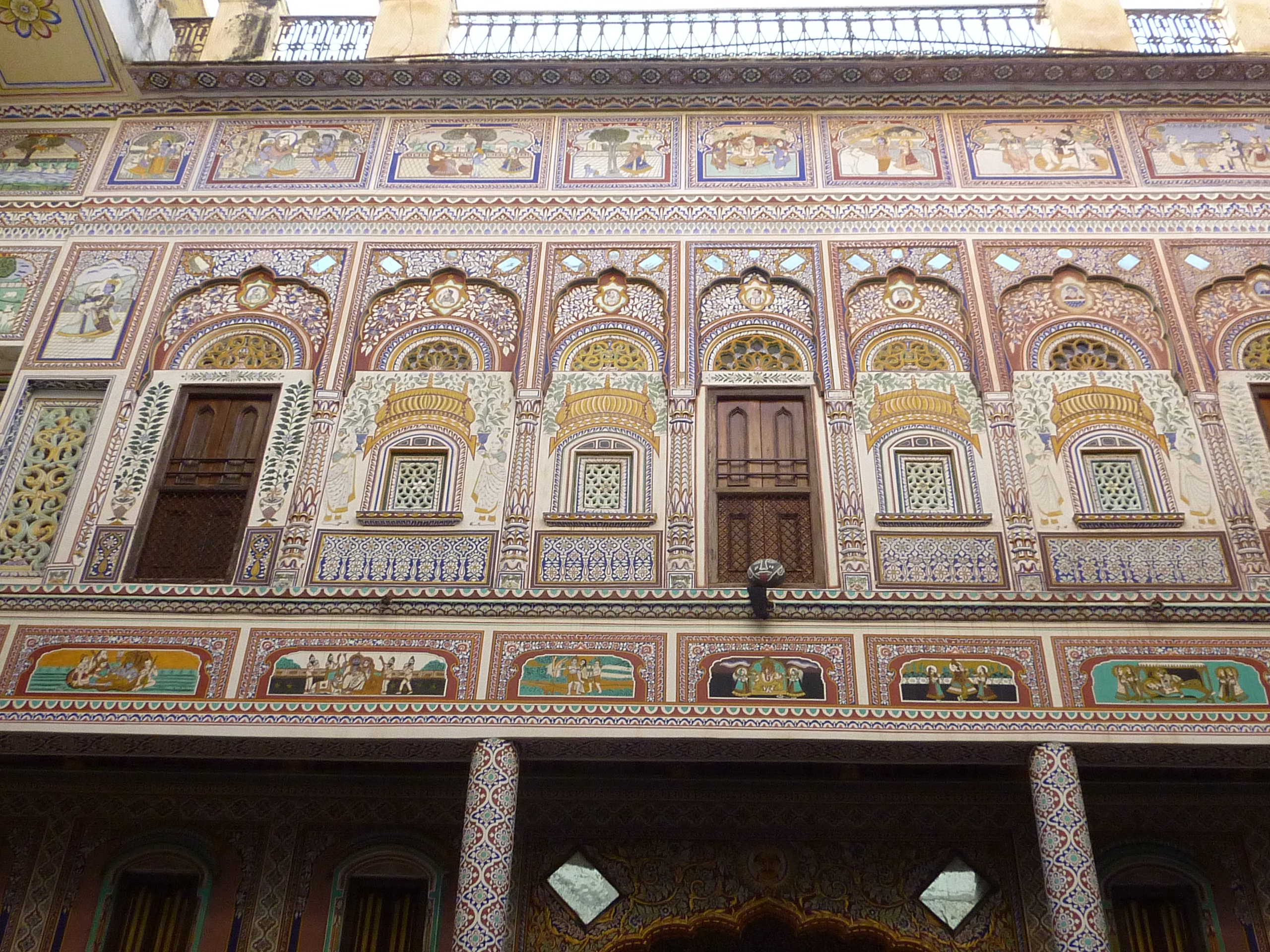 en deuren, zijn geweldig mooi bewerkt met fresco's, houtsnijwerk en jali's. Jali's zijn ramen met een mooi opengewerkt raster in steen. Het laat de wind door en de doorkijk is minimaal. De fresco's in Nawalgarh waren bijzonder mooi; sprookjesachtig.