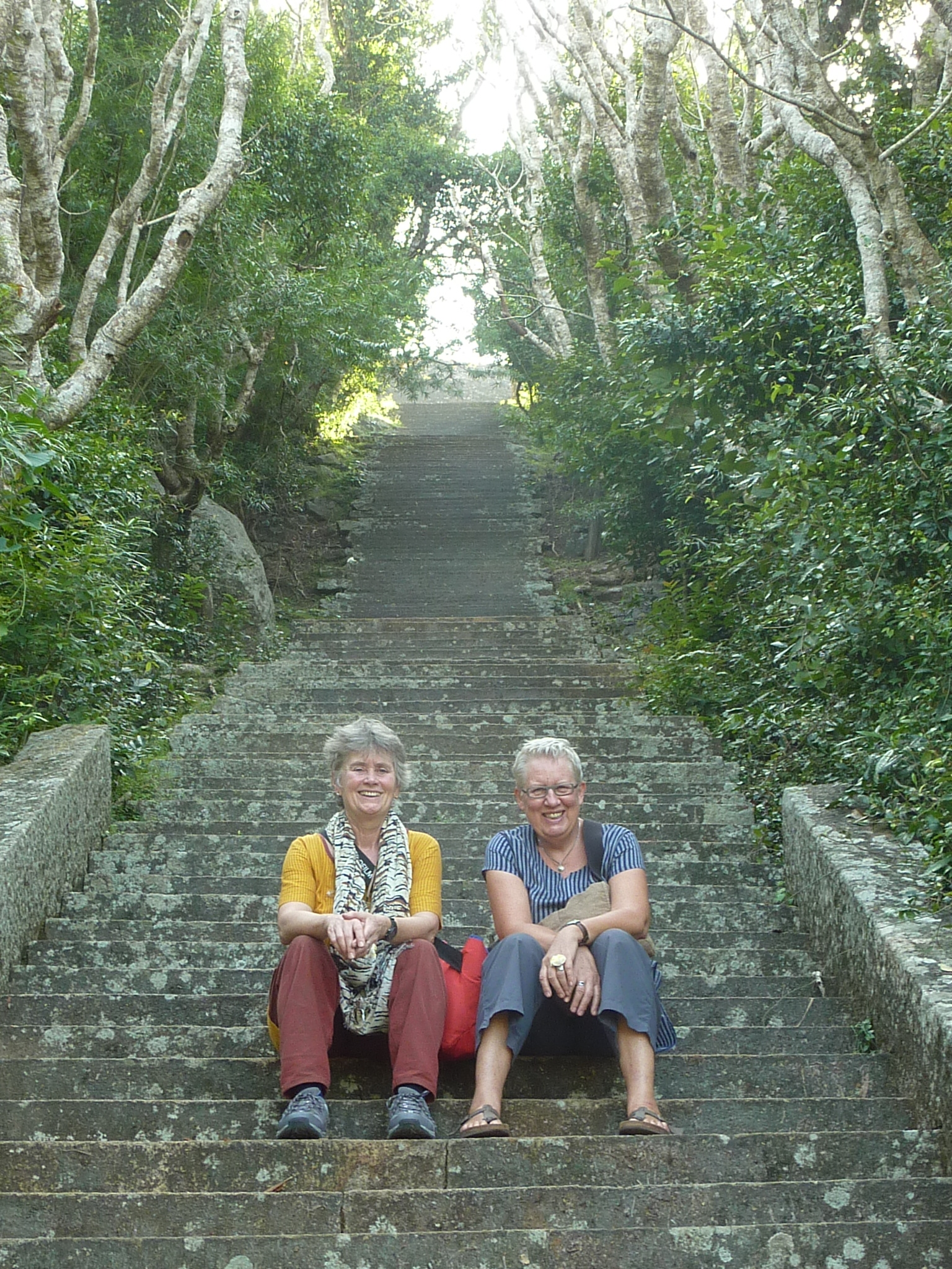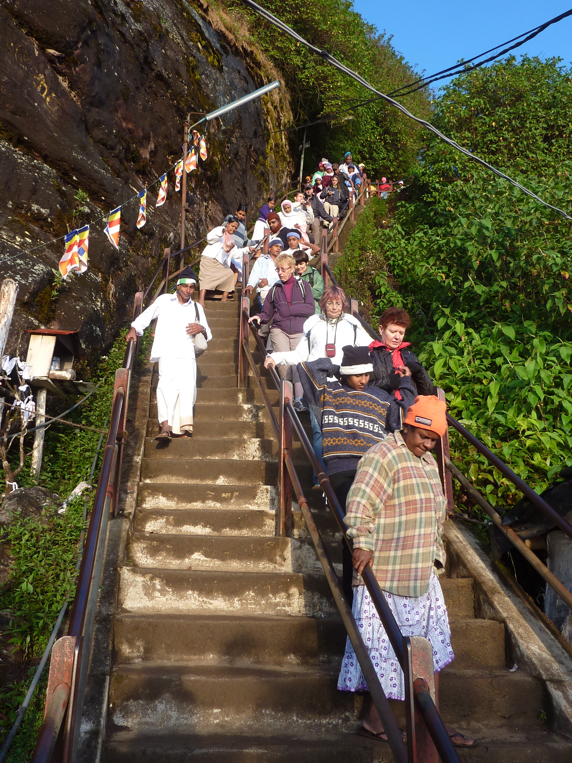 Dat is een heilige berg van 2243 m hoog. Niets vergeleken bij de Mount Kailash in Tibet op 5630 m., maar je begint hier natuurlijk lager en de klim is zeker zo zwaar. Het is een steile piek in het landschap waar je gedurende 7 km maar liefst 5500 traptreden op gaat. Sommigen zeggen zelfs 6000. En dat is heel erg veel zweten. De berg wordt vooral door boeddhisten vereerd vanwege een voetafdruk van de Boeddha die er op de top gevonden zou zijn, maar ook hindoes, moslims en christen hebben een eigen verhaal over wat er boven