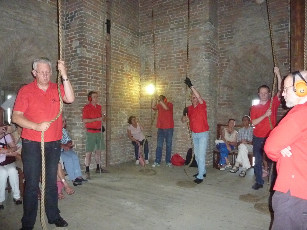 25 juli is de naamdag van Jacobus. Het is de dag waarop veel pelgrims in Santiago de Compostella aankomen. Er valt dan immers iets te vieren! Ook in Utrecht zorgt het Nederlands Genootschap van St. Jacob voor een ‘viering’ in stijl. Met mijn vertrek op 1 augustus in het vooruitzicht moest ik daar natuurlijk naartoe. Om alles helemaal in het teken van voorbereiding te plaatsen leek het mij bovendien een heel goed idee om vooraf een ferme wandeling te doen. Op deze zonovergoten warme dag liep ik aldus met mijn wandelmaatjes van Woerden naar Breukelen en vervolgens langs de Vecht naar Utrecht. Een afwisselende en fraaie route van zo’n 32 km. We bereikten zowaar op tijd de Jacobikerk in Utrecht. Na het Dommelsch en de Jupiler vergeleken te hebben gingen we met het klokkenluidersgilde de toren op, waar om 7 uur een fraai geregisseerd en met de hand bediend klokkenspel plaatsvond. Voor deze gelegenheid werd begin en eind van het klokkengelui (of was het nu klokkengebeier…..de verschillen werden haarfijn uitgelegd) uitgevoerd door de Jacobusklok. Daarnaast deden nog mee de Salvadorklok, de Maria-, Joseph- en Johannesklok. Tja, je steekt een hoop op op zo’n bijeenkomst. De mannen van het gilde hebben er een historische klus aan. Vroeger ging de communicatie met de stad via de klokken. Of het nu brand, handel, begrafenis of geboorte betrof. Tegenwoordig kunnen wij geen klokgelui meer onderscheiden; laat staan verstaan! Daarna togen we naar het pand van het Genootschap aan de Janskerkhof voor de onthulling van het nieuwe uithangbord in de vorm van een schelp. Geen verrassend design; wel fraai gemaakt en onmiskenbaar passend. In de St. Janskerk werd er nog gezongen en voorgedragen onder vioolmuziek. Heel stemmig en onze voetjes vonden het heerlijk om even niets te hoeven doen. Ik ben nu helemaal klaar en voorbereid om woensdag op pad te gaan.