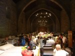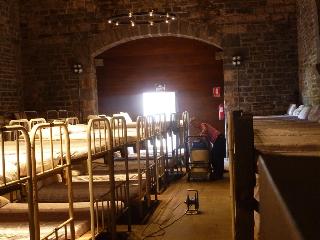 voor het sluiten van de deur om 10 uur draaien we een lekker rustgevend muziekje. Veel mensen reageren daar verrast en enthousiast op. Het is een mooie manier om goede nacht te wensen. Eigenlijk vind ik het verbazingwekkend hoe 120 mensen in één ruimte zo sociaal met elkaar om kunnen gaan. Over het algemeen valt op dat pelgrims geduldig, inschikkelijk en niet klagerig zijn. Als iedereen in zijn bed ligt gaan wij er nog even van tussen naar “onze huiskamer” voor een glas wijn en wat napraten. We hebben in de nieuwe herberg een comfortabel onderkomen en worden verwend met veel lekkernijen door het hoofd van het klooster. De taken verdelen we met elkaar, rekening houdend met ieders kwaliteiten. Er zijn steeds twee ploegjes nodig: een voor de oude en een voor de nieuwe herberg. In de dag zijn er ’s ochtends schoonmaaktaken te verdelen en ’s middags receptie, ontvangst, vraagbaak en wasserijtaken. xc9en iemand slaapt in de oude herberg en opent er om 6 uur de poorten. Tot op heden is het mijn ochtendtaak om te stofzuigen in de grote oude herberg en er de bedden te fatsoeneren. Eerlijk gezegd vonden mijn maatje Wim en ik de bedden er vies uitzien. In 2 dagen tijd zijn nu bijna alle lakens van alle bedden gewassen. Dat oogt en ruikt een stuk frisser! Vanmiddag heb ik achter de balie gezeten. Dat heet hier “de kist”. Dat is een goede omschrijving: het ziet er uit als een houten bak. Daar komt elke wandelaar zich inschrijven en een bednummer in ontvangst nemen. Als baliemedewerker moet ik dan ook credentials afstempelen en pelgrimsartikelen verkopen. Het is routineus werk, zeker als er net een grote groep wandelaars arriveert en de rij wachtenden lang is…. Tussendoor gebeurt er van alles. Gekke en onverwachte dingen. We zijn er druk mee. Ik ben hier nu al 3 dagen maar dit is pas het eerste moment om even rustig achter de computer te kunnen zitten.