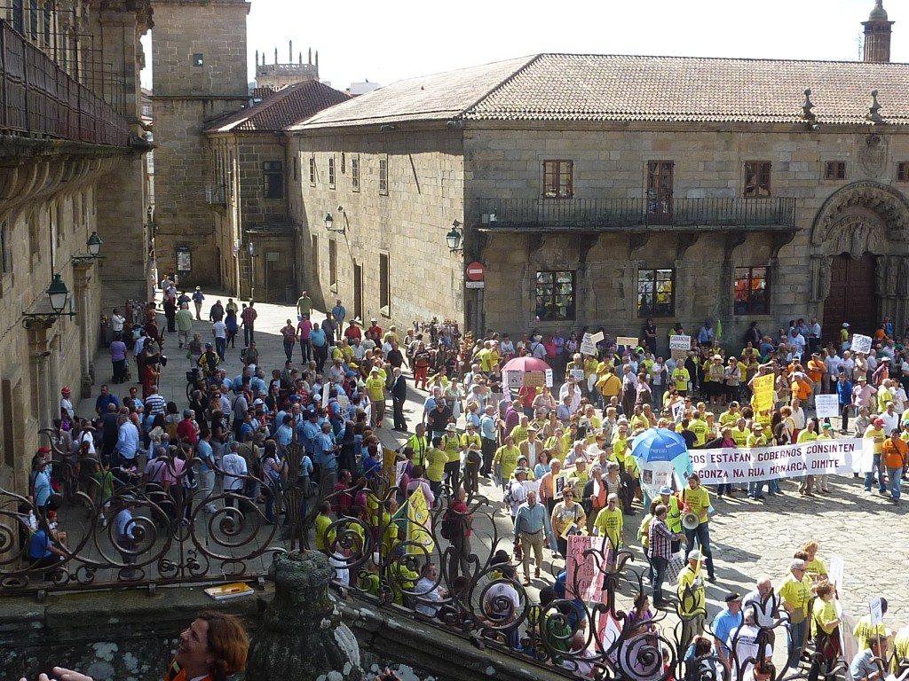 eens een krant opgeslagen maar dat waren altijd regionale bladen en daar staat werkelijk niks interessants in voor mij. Hier in Santiago merk ik pas voor het eerst dat Spanje echt in beroering is. Voor de kathedraal is er een grote demonstratie met delegaties van heinde en ver tegen de huidige politiek en vooral tegen de banken. In het begin had ik eens een dag gelopen met 2 jonge Spanjaarden, die zich slachtoffer voelden van de crisis. Allebei ingenieur, geen werk en daarom maar de camino aan het lopen. Zij hadden hun hoop gevestigd op een baan in Duitsland of Nederland. Voor Spanjaarden is Nederland nog steeds welvarend en een land waar werk zat is. Ik denk niet dat alle nederlanders daar hetzelfde over denken…..