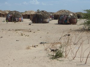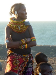 Via Marsabit (regen!) en het bloedhete dorre North Hor trokken we door de Chalbi woestijn naar het Turkana meer,waar het water groenig kleurt door de fluor en waar het altijd hard waait ’s nachts. Het is het leefgebied van de Elmolo. Daar sliepen we niet in onze tenten maar in hutjes. Vanwege de hitte ben ik op mijn matrasje buiten gaan liggen, maar daar woei ik zowat met matje en al het meer in. Het zijn in ieder geval streken waar weinig toeristen komen. Afgelopen jaar 30, hoorden we. Nou, daar ken ik er dan toch al 4 van!!!