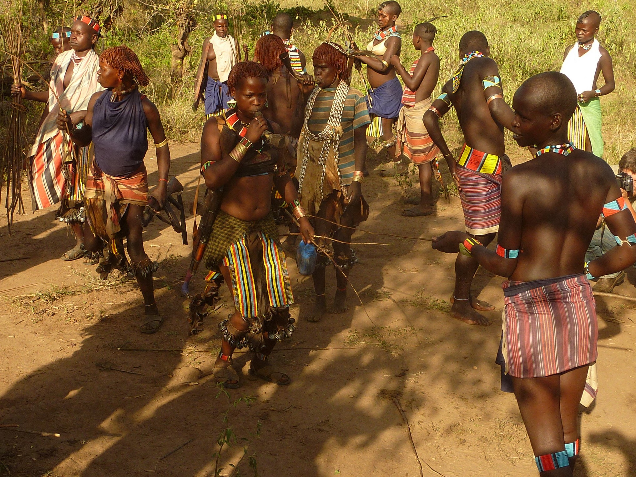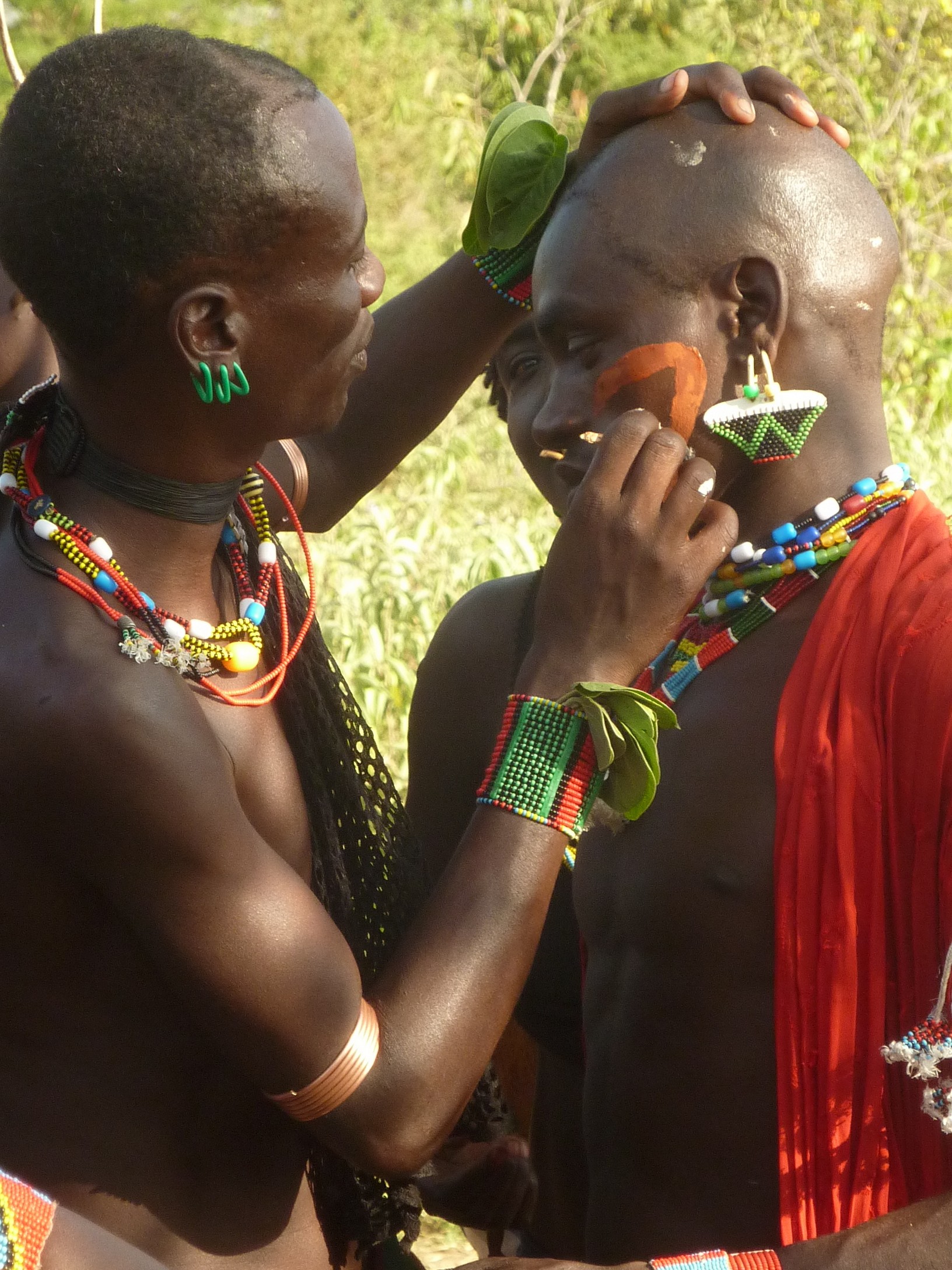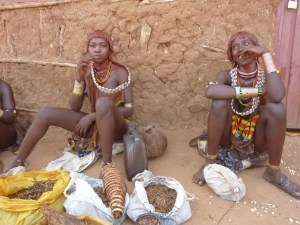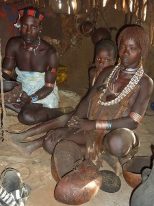 Reizen door Zuid Ethiopie en Noord Kenia is heel bijzonder, maar vermoeiend. Er zijn op een gegeven moment alleen nog maar zandwegen, doornenstruiken, kamelen en veel stof. Over het algemeen reden we niet harder dan 20 km per uur. In Zuid Ethiopie zijn we in de Omo vallei bij de Konzo, de Hamar en de Mursi stam geweest. In Noord Kenia bij de El Molo, de Turkana en de Samburu. Het zijn allemaal veehoeders, die met grote kuddes koeien rondtrekken. De ene stam is al kleurrijker dan de ander: uitgedost met veren, speren en veel kralen, kettingen en armbanden. Ze zijn niet allemaal even toegankelijk of blij met een paar witneuzen. Ons verblijf bij de Hamar vond ik veruit het geslaagdst. We hebben er in een dorpje van de Hamar gekampeerd. Dat is je tent open doen en tegen een rij nieuwsgierige meisjes in geitenvellen aankijken; en eten bij de truck met een groep van zeker 60 man om je heen die tot in detail volgen wat je aan het doen bent. Zij kijken naar ons en wij naar hen; eigenlijk wel in evenwicht. Bij de Hamer hebben we een hele dag feesten en rituelen meegemaakt o.a. het bull-jumpen. Onderdeel van de initiatierite van 15 jarige jongens naar volwassenheid is dat ze hun kracht en mannelijkheid moeten bewijzen door over de ruggen van een rij stieren te lopen. Die stieren worden aan de ene kant bij hun staarten vastgehouden en aan de andere kant bij de horens. Na een lange middag van tromgeroffel, drinken van liters zelfgestookt bier, uitzinnig dansen en zwaaien met kalashnikofs, lieten de (inmiddels dronken) vrouwen zich kastijden door de jongens met zweepslagen op de blote ruggen; tot bloedens toe. Sommige jongens leken er niet zo veel zin in te hebben, maar het was duidelijk dat ze het moesten doen. Zij waren nog helemaal nuchter, zelfs bedeesd, terwijl alle vrouwen om hen heen hen woest uitdaagden. De jongens zagen er prachtig uit en maakten elkaar extra mooi met het beschilderen van elkaars gezichten. De Hamar hebben een typiese haardracht: ze maken een papje van rode oker met boter waarmee ze strakke strengen op het hoofd maken. Door hitte en zweet loopt die rode oker op een gegeven moment het hele lijf over.