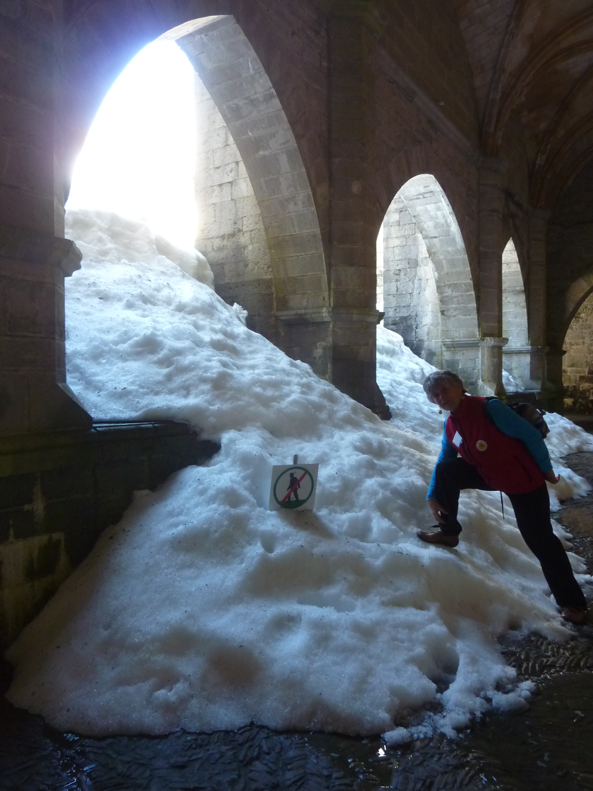 naar Roncesvalles gereden. Het weekend is het stralend weer geworden met temperaturen die stegen tot wel 26 graden! Bij aankomst lagen de sneeuwhopen nog tot 2 meter hoog, maar die verdwijnen nu letterlijk als sneeuw voor de zon. Het voorjaar is definitief aangebroken. Vrijdag en zaterdag stond er nog een sterke ijzige wind. De pelgrims die de route Napoleon hadden genomen over de Pyreneeen moesten daar zwaar tegenop boksen. Veel