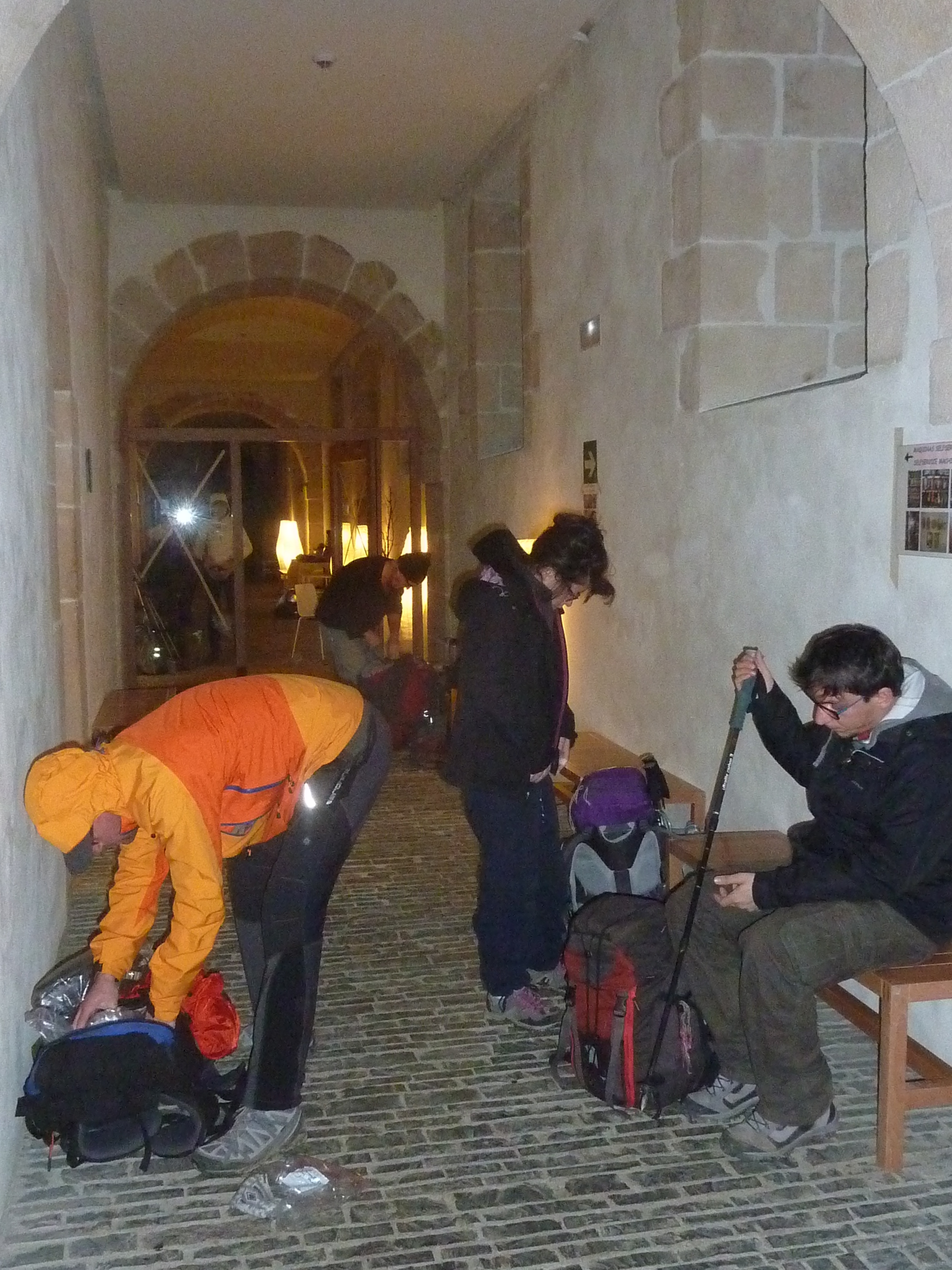 pelgrims zelf moeten doen; over het algemeen wordt er helemaal niet gereserveerd. Je loopt en kijkt bij aankomst of er plek is in de herberg. Buiten dat is het raar dat grote groepen denken dat je met zijn allen zomaar onderdak vindt in één en dezelfde herberg. Ze hebben gewoon geluk gehad dat de herberg van Roncesvalles zo groot is dat ze er allemaal konden slapen. Na een staande vergadering in de gang trok de groep de donkere regenachtige nacht in.