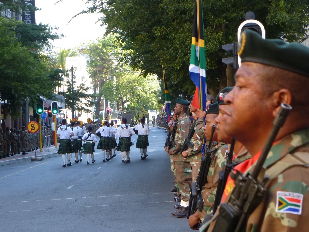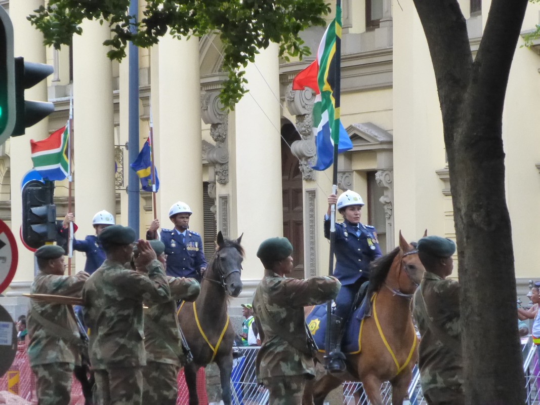 heel gevolg. Dat voelde eventjes als een bijzonder moment; ze was overigens vertrokken voor ik het goed en wel doorhad. ’s Avonds bleken de straten rondom het parlement geheel in beslag genomen door uitgebreide militaire parades ter ere van de 20e opening van het parlementair jaar. Dat doen ze hier elk jaar. Dat is een potsierlijk gebeuren, waarbij Schotse doedelzakkers en vaandeldragers te paard bepaaldelijk geen modern Zuid Afrika uitstralen.