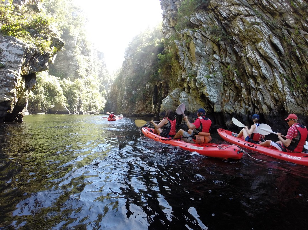 oostelijk stukje van de Garden route. Het is hier paradijselijk mooi. Groene bergen, torenhoge oeroude bomen, jungle en een fantastische kustlijn. Gister ben ik wezen kayakken op de Stormsriver. Ik heb wel eens gekanoed, maar dit was toch weer wat nieuws. Na een korte instructie gelijk de grote Indische Oceaan op om van daaruit de Stormsriver op te peddelen.