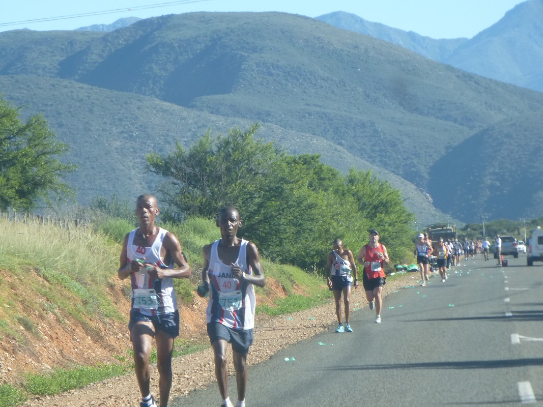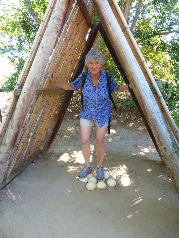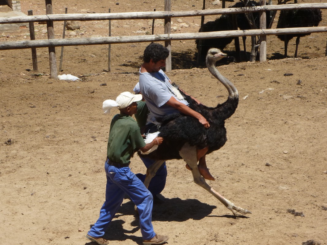 gegaan, waar zowaar een marathon aan de gang was! Oudtshoorn is beroemd vanwege de 75000 jaar oude grotten en de struisvogelboerderijen. Daar beproeft menigeen zijn rijkunsten op een struisvogel. Ik heb het niet verder gebracht dan een standje op de