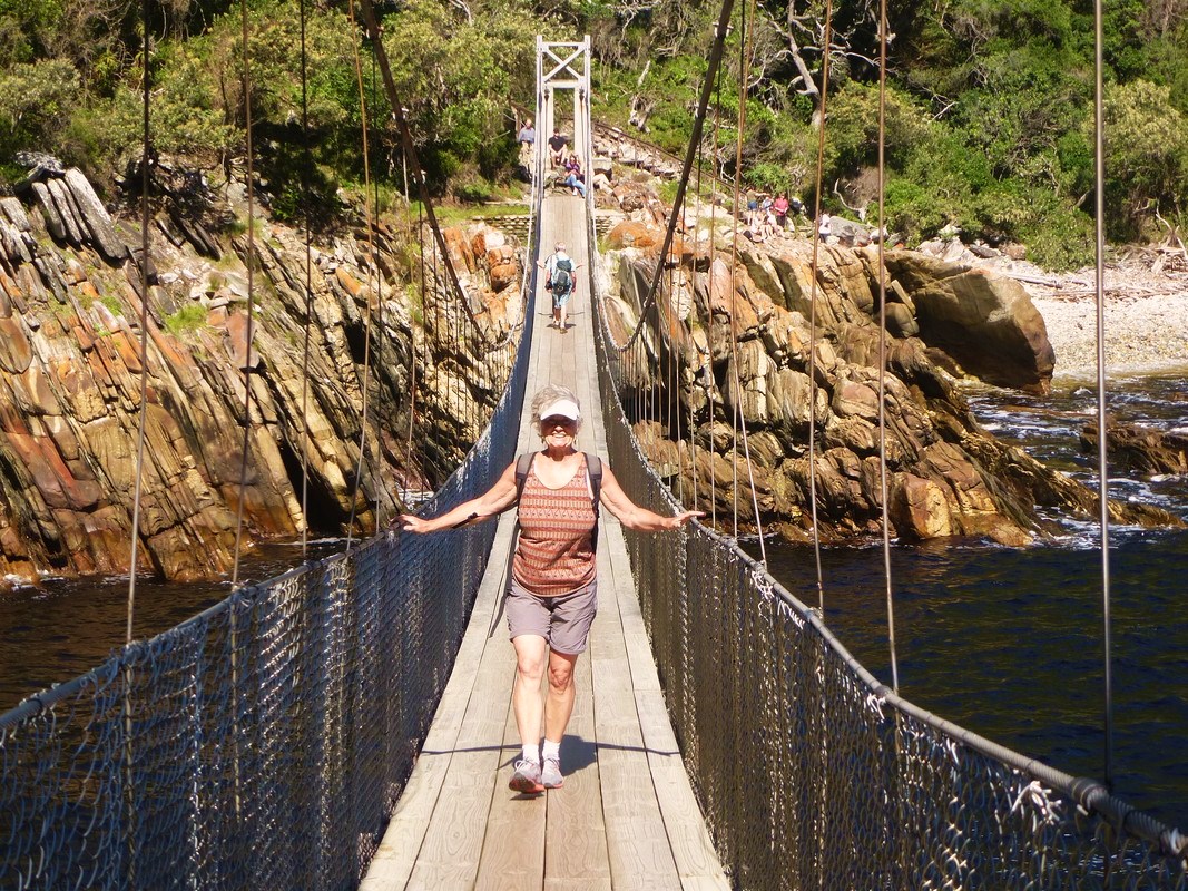 beroemde Suspencion bruggen door: dat zijn een drietal hoge lange hangbruggen. Op dat moment waren we al door en doornat, maar dat is met de hitte hier eerder aangenaam dan vervelend. De route ging een eind door de hoge kloof totdat we moesten aanleggen voor wat rotspartijen. Daarachter gingen we verder op waterbedden. Veel spetteren en fun. Het duiken vanaf hoge rotsen heb ik aan anderen overgelaten…..Hier werden vroeger gekapte bomen van boven naar beneden de kloof in gedropt en dan overgeladen op schepen voor transport over de Oceaan. Die houtkap is nu verboden. Nu mogen er alleen nog de zgn Kaapse dennenbomen gekapt en verhandeld worden tegen de verplichting van heraanplant. Het stuk jungle met oeroude bomen is niet zo heel groot meer en wordt nu gelukkig beschermd. In George, waar ik logeerde bij Myra, heb ik gezien wat ze vroeger deden met