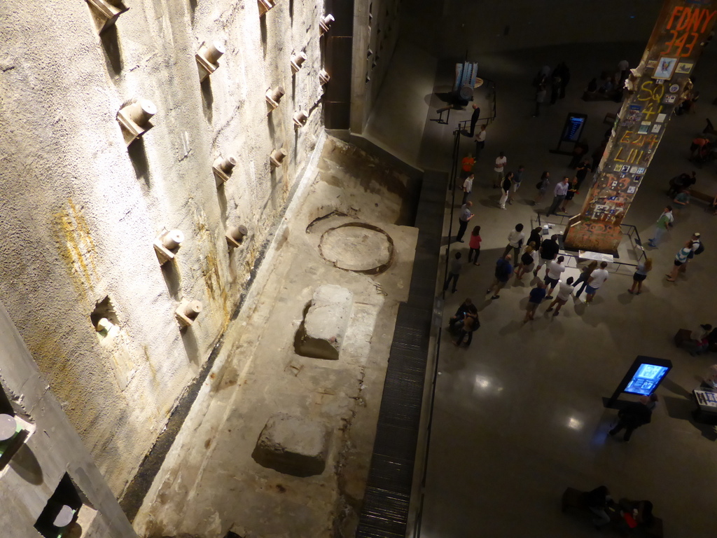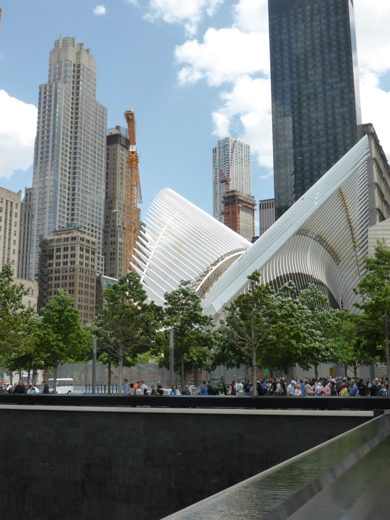 heel grote ruimte langs de oude fundamenten van de Twins met foto’s , herinneringen aan gebeurtenissen en slachtoffers alsook de solidariteitsbetuigingen van de periode erna. Boven naast de bassins wordt driftig gebouwd aan het nieuwe World Trade Center; met meerdere towers. Eén Tower is af, de anderen staan in de steigers. Het ondergronds Oculus station is bijna af. Als ik over een paar jaar terug ga zullen er ongetwijfeld