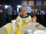 bestek hebben’. Wat een verspilling en wat ongezellig. Al snel ontdekte ik dat dat bijna overal zo is. Het is hier echt een wegwerpmaatschappij. Heel wat erger nog dan bij ons. Desalniettemin heb ik mij het ontbijt in het hotel goed laten smaken. Er was ontbijtbuffet met donuts, muffins en zelf te roosteren vierkante sneetjes wit of bruin. Gelukkig was er ook havermout én zelf te maken wafels. Het deeg kwam weliswaar kant en klaar uit een apparaat in een plastic bekertje maar dat moest je dan helemaal zelf uitgieten in een wafelijzer. En dan had je toch het idee dat je de wafel zelf gemaakt had! Hoe je een kind blij maakt!