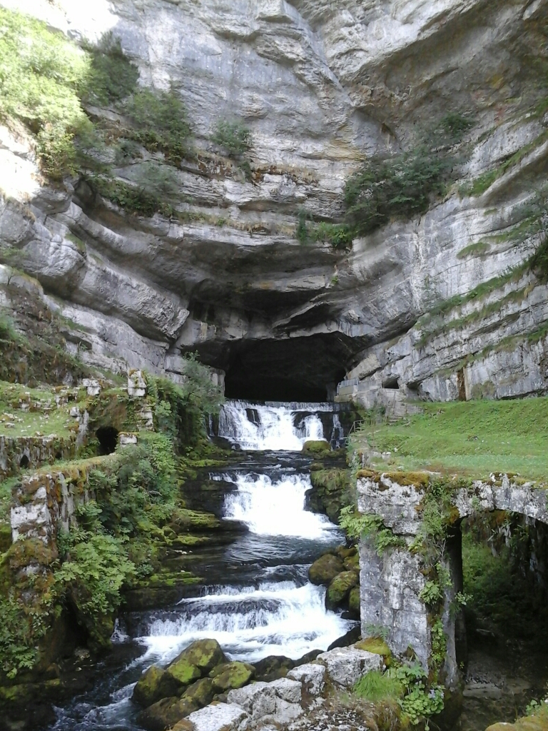 De route liep tot aan de bron van de Loue. Wij dachten dat het een rustig riviertje zou worden met een gemakkelijke wandeling langs de oevers. Dat pakte verrassend anders uit. Het pad ging omhoog langs een gorge met onder ons een alsmaar woester wordende rivier met cascades. Heel mooi en ook heel fijn om er niet alleen te lopen, want toch een beetje gevaarlijk. De bron bleek uit een gat in een rots te komen. Heel merkwaardig waar al dat water zomaar vandaan komt!