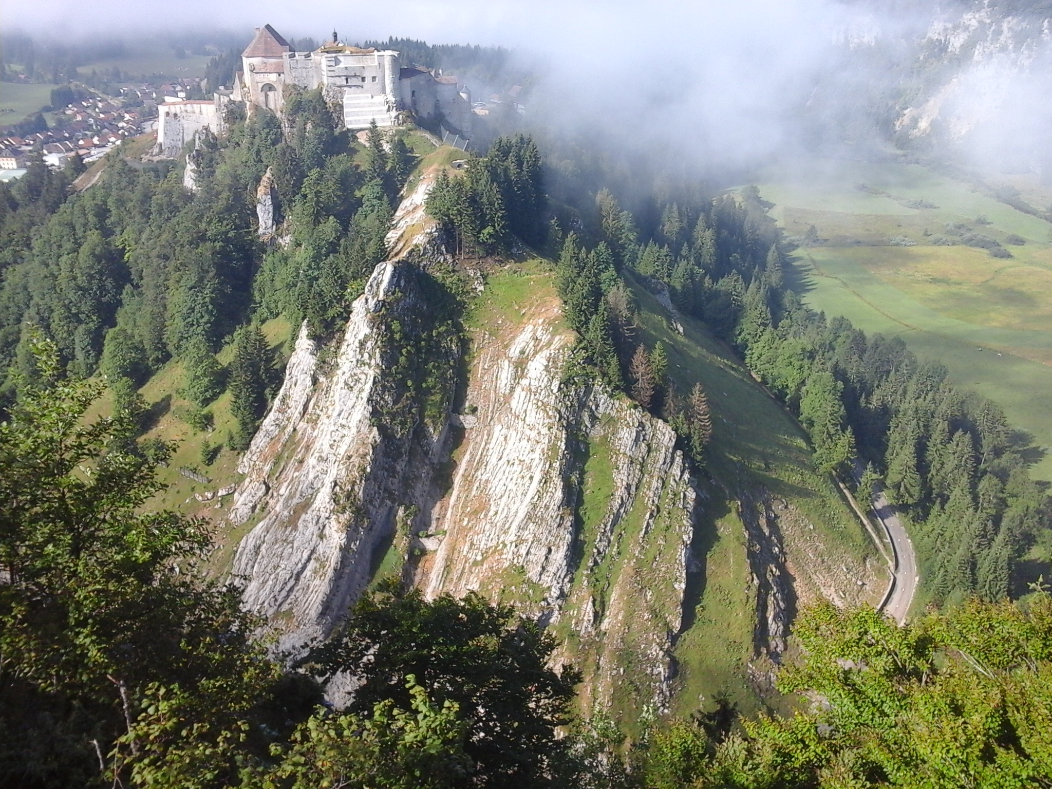 Na Besancon was het gedaan met de droge dorre gele landschappen. Je gaat er de hoogte in en het is gelijk groen. Met het hete weer is het ook gedaan. Vandaag de eerste regendag meegemaakt. Zo loop ik mijn grote regenponcho in ieder geval niet voor niks mee te sjouwen. Dat is een troost. De temperatuur is 20 graden gedaald; ik had het zelfs koud vanmiddag. Hier in Pontarlier heb ik me lekker laten verwarmen door de originele absinthe, die hier vandaan komt. Hij wordt geserveerd met een grote bolle karaf die je laat druppelen boven een gaatjeslepel met suiker. Je doet het kraantje dicht als je niet meer water erbij wenst.