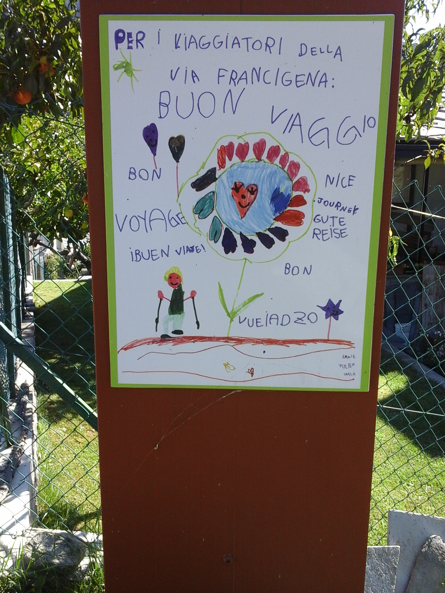 De Via Francigena wordt ook in Italie omarmd, getuige de goede bewegwijzering (tot nu toe) en de bekendheid bij de mensen. Leuk om onderweg bij een woonhuis zo’n schattige kindertekening tegen te komen.