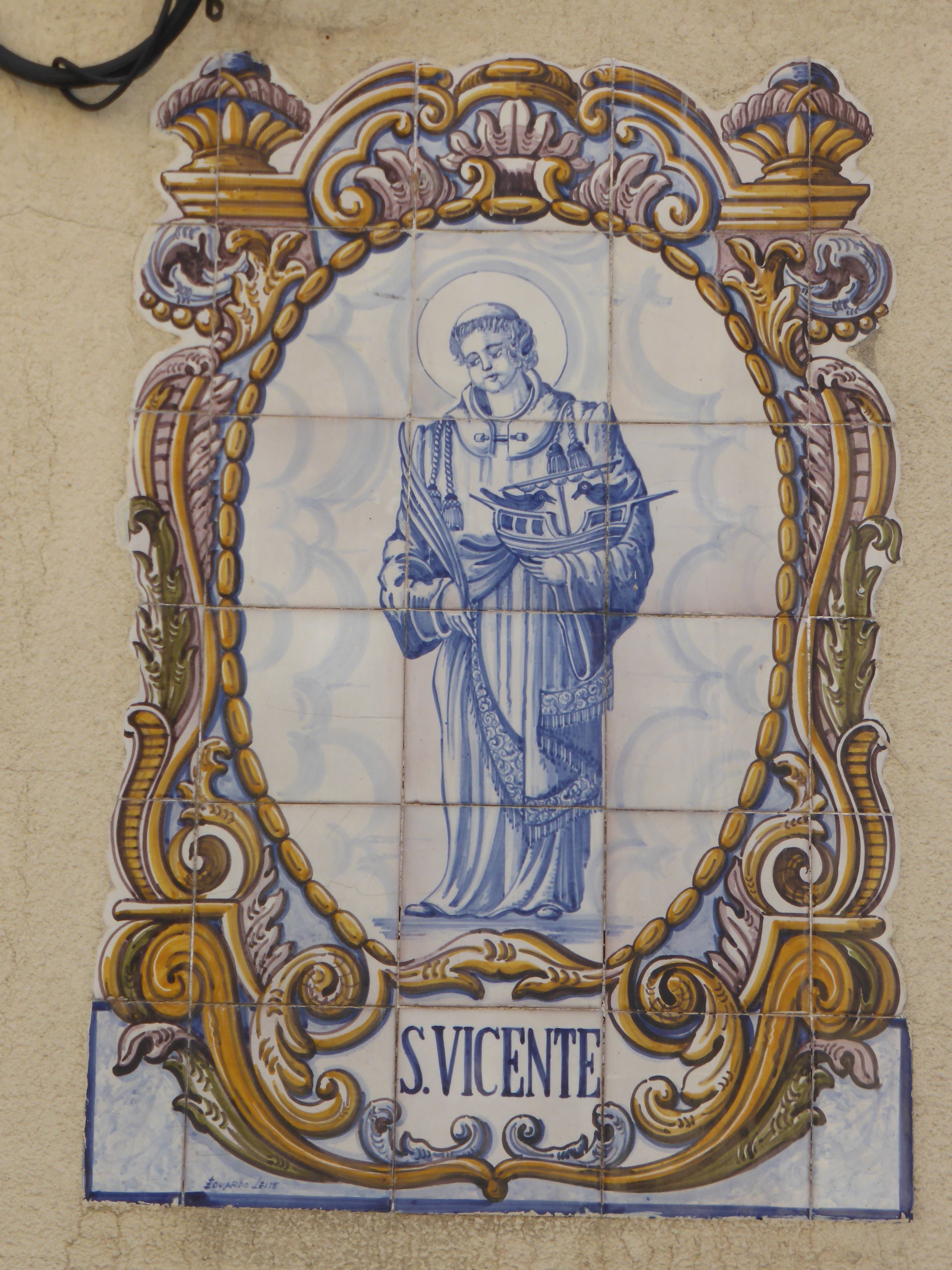 In Lissabon kwam ik er pas achter dat de Rota Vicentina ook een pelgrimstocht is. Eigenlijk had ik moeten starten op de Kaap Sao Vicente. Vincentius is in het jaar 304 in Valencia de marteldood gestorven. Zijn lichaam zou daarna met een boot, bewaakt door raven, zijn aangespoeld op het zuidwestelijkste puntje van Europa, op de kaap die daarna Cabo de Sao Vicente is genoemd. Zijn lichaam is later bijgezet in de kathedraal van Lissabon en Vincentius is de patroonheilige van Portugal geworden. De boot met de raven is nog steeds te zien in het wapen van de stad Lissabon. De igreja Sao Vicente de Fora (niet ver van het Castelo) gedenkt deze grote weldoener.