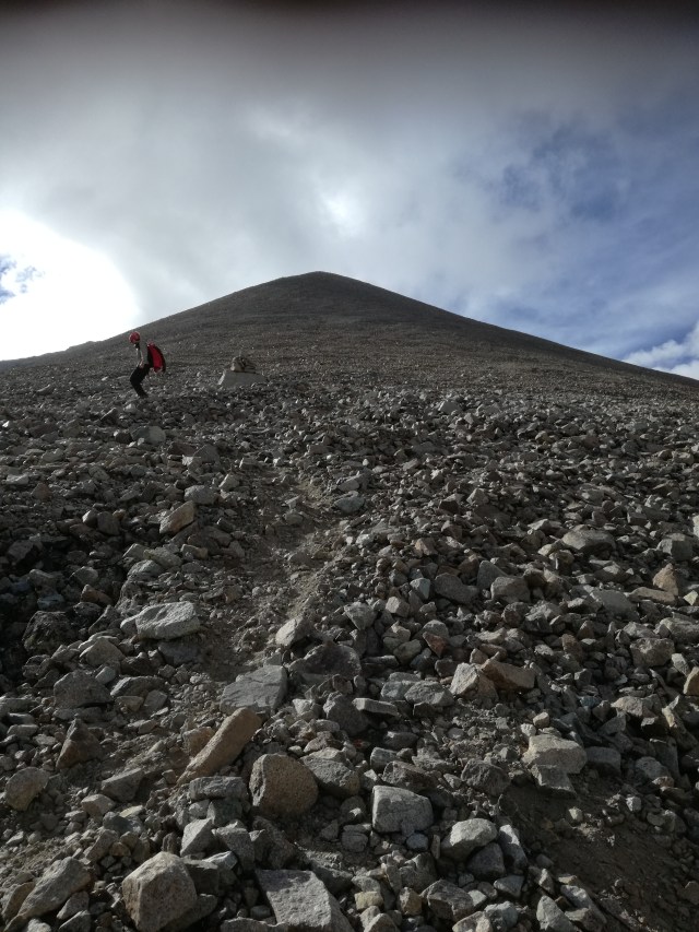 In Tibet en Ladakh kon ik het aan om op 5600m hoogte te lopen. Hier moest ik echter al op 3500m afhaken met ademhalingsproblemen. Chantal heeft de laatste paar honderd meters omhoog over schuivend stenig terrein wel gedaan. Echt stoer hoor! Die steile helling leek me overigens sowieso té uitdagend voor mijn opspelende hoogtevrees.