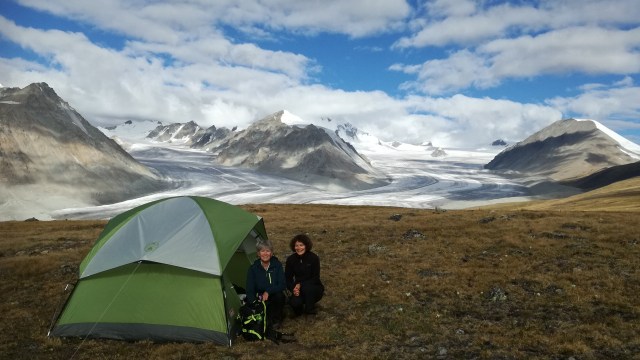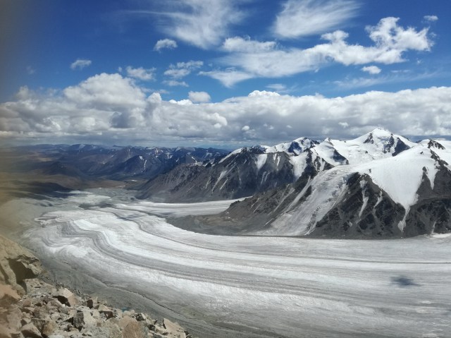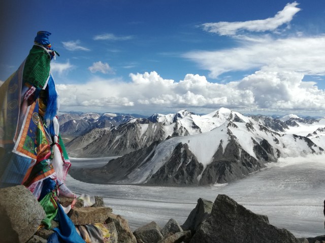Bij deze peak ligt de immense gletsjer Potanin(vernoemd naar Russische ontdekkingsreiziger), waar wij de prachtigste kampeerplek hadden van deze reis.