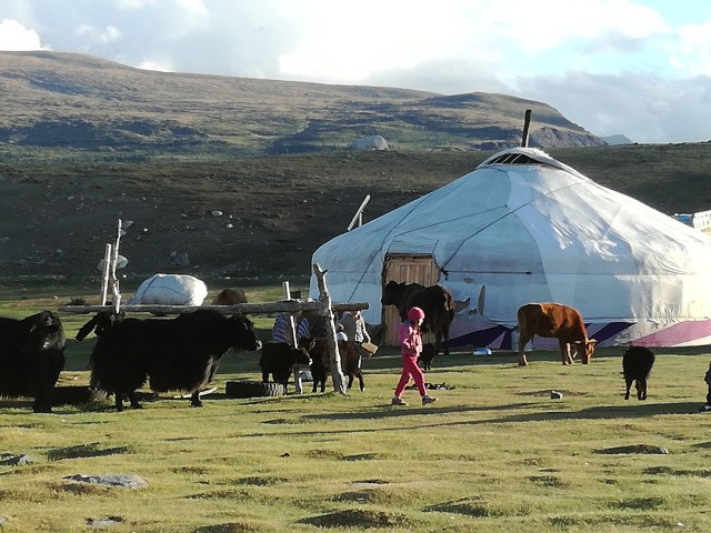 De Altai is zoiets als cowboyland in het verre Westen, van Mongolie. Dunbevolkt met Kazakken (Turks verwant) en de blondere Tuvans (Russisch verwant). Het leven is er hard en primitief. Geen electriciteit en water. Zelfs een simpel toilet als een gat in de grond achter een halfhoog stenen muurtje heeft niet iedereen. Je loopt maar een eind weg om uit het zicht te zitten. De gers of yurts (=russisch) kunnen comfortabel zijn met mooie kleden op de grond en langs de wanden, maar de vloer kan ook gewoon het gras zijn.