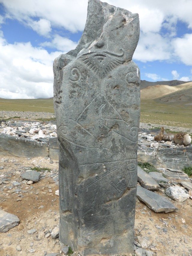 Voor archeologen is er nog genoeg te doen in Mongolie. Wij zagen op verschillende plekken in het verre Westen interessante dingen. Balbals zijn rechtopstaande stenen gegraveerd als mannen met diverse attributen. Ze staan voor een rechthoekig stenen graf en dateren uit de Turkse tijd. Die duurde ongeveer 2 eeuwen tussen de 5e en de 7e eeuw. Daarna zijn ze verdreven door de Oeigoeren. Deze balbals staan soms alleen, soms met zijn 3, aan het eind van een lange rij opstaande stenen die in Noord / Zuid richting opgesteld staan in een heel weids landschap.