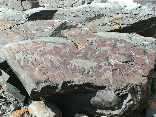Wel hebben wij op 2 plaatsen grote hoeveelheden petroglyfen aangetroffen. Op onze kampeerplek Shiveet Khairkah zat het er vol. Deze zouden ook dateren uit de Bronzen tijd dwz 2500 tot 700 voor Chr. Frappant is dat al deze petroglyfen gekerfd zijn op stenen gericht op het zuiden, waar een rivier loopt. Al fantaserend dachten Chantal en ik dat er ook heel veel versteende boomstukken lagen en dat er wellicht een groot bos gestaan heeft. Aan verbeelding geen gebrek maar wij zijn geen archeologen dus…….