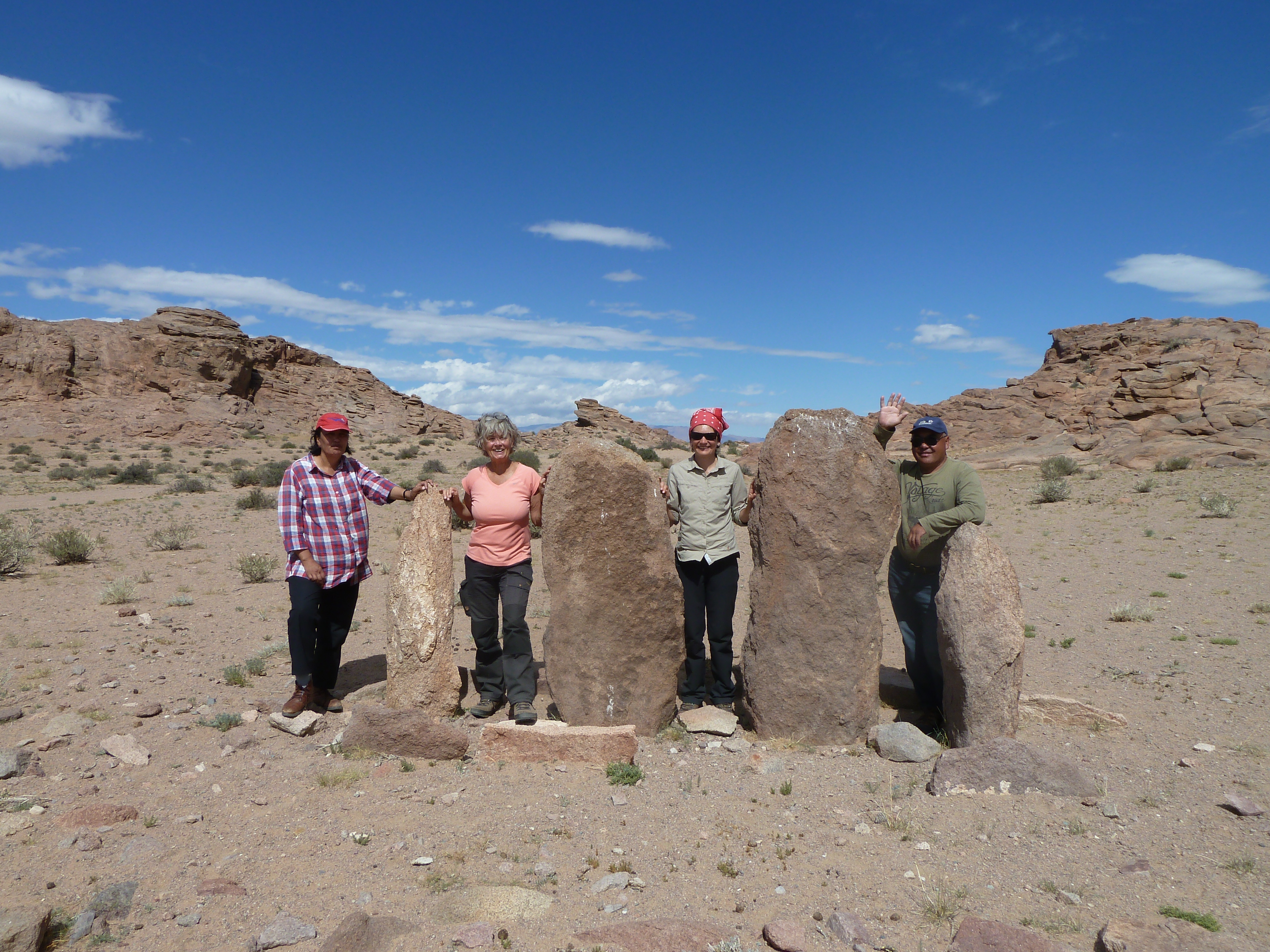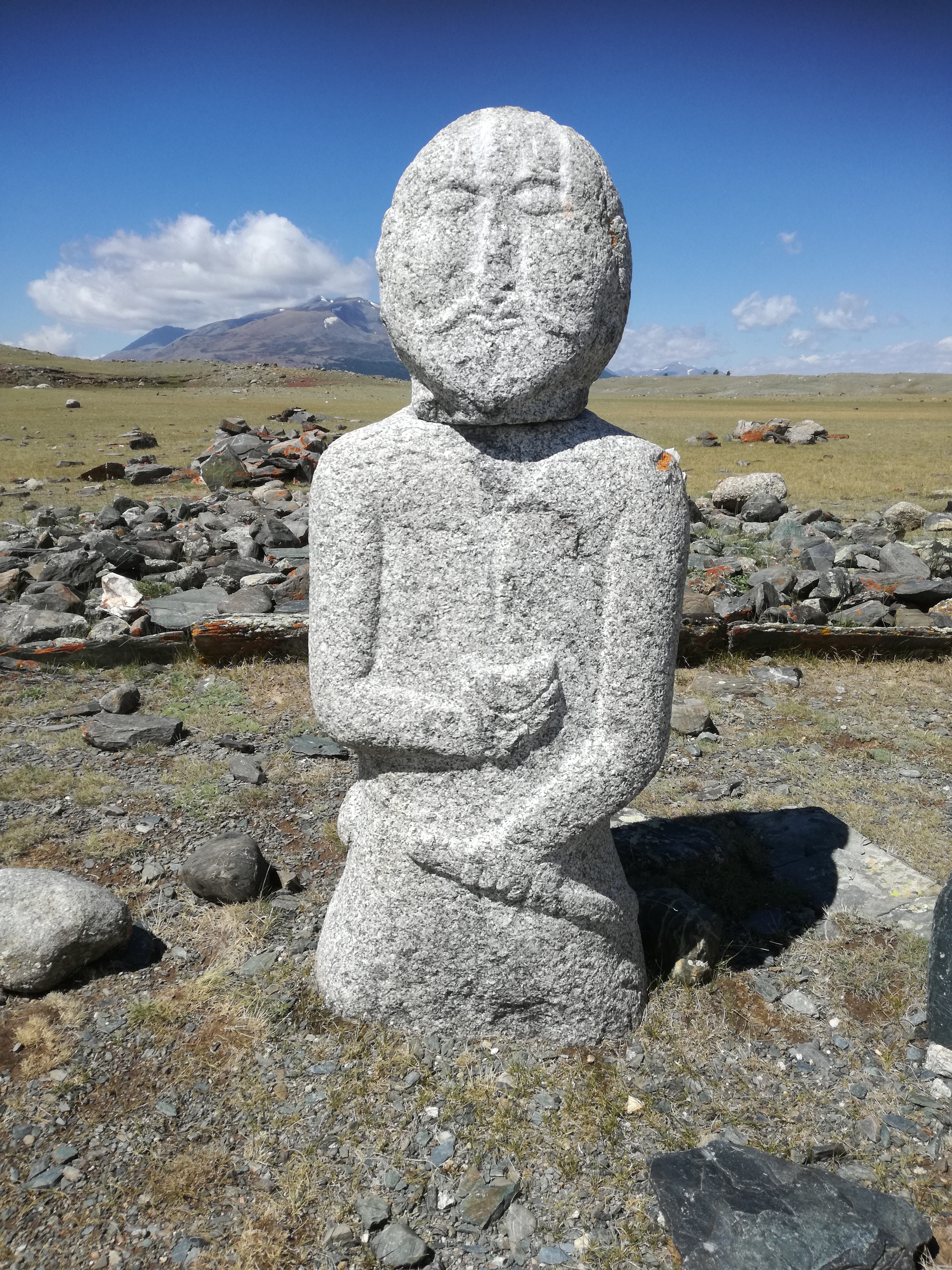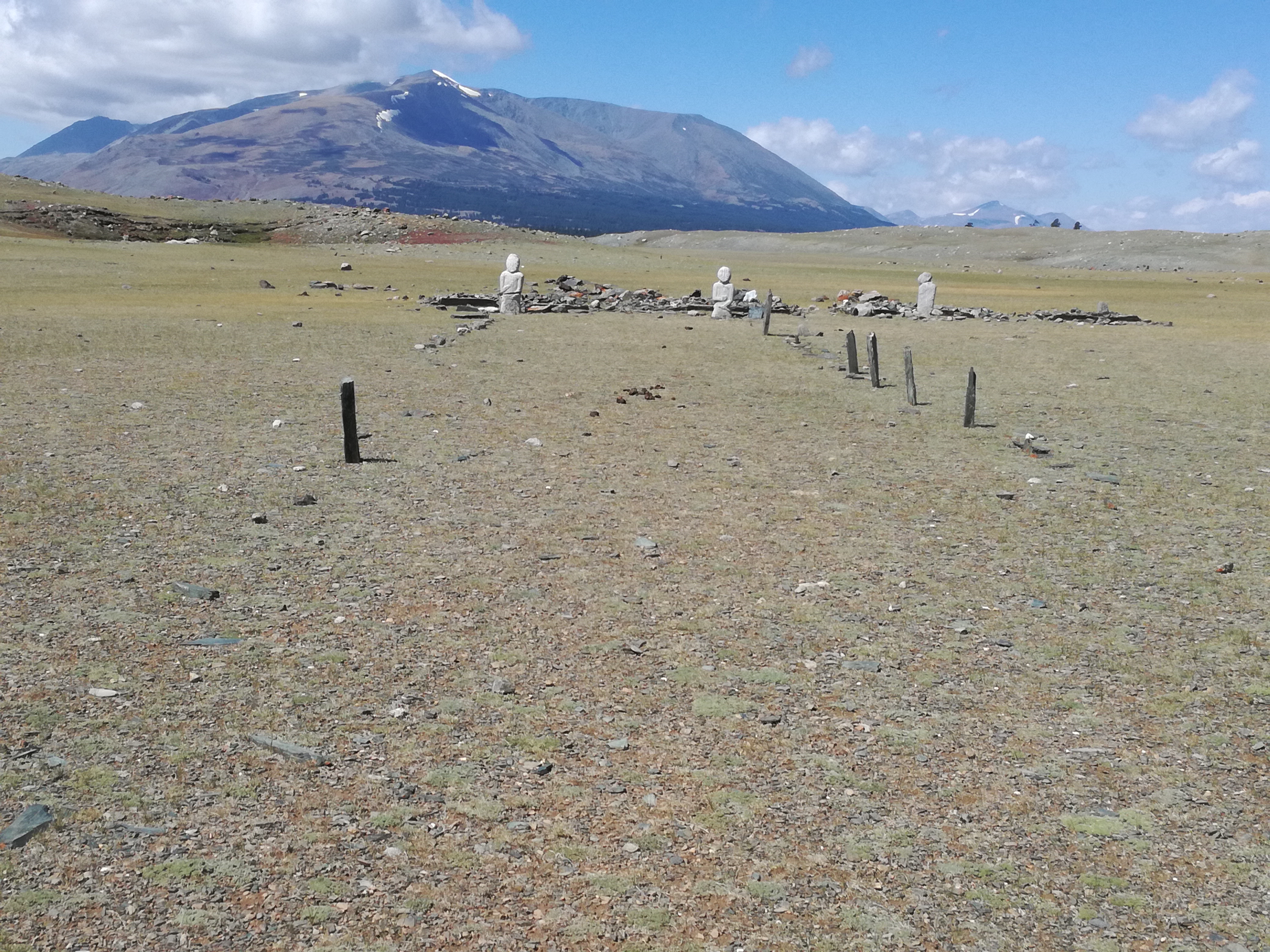 Voor archeologen is er nog genoeg te doen in Mongolie. Wij zagen op verschillende plekken in het verre Westen interessante dingen. Balbals zijn rechtopstaande stenen gegraveerd als mannen met diverse attributen. Ze staan voor een rechthoekig stenen graf en dateren uit de Turkse tijd. Die duurde ongeveer 2 eeuwen tussen de 5e en de 7e eeuw. Daarna zijn ze verdreven door de Oeigoeren. Deze balbals staan soms alleen, soms met zijn 3, aan het eind van een lange rij opstaande stenen die in Noord / Zuid richting opgesteld staan in een heel weids landschap.