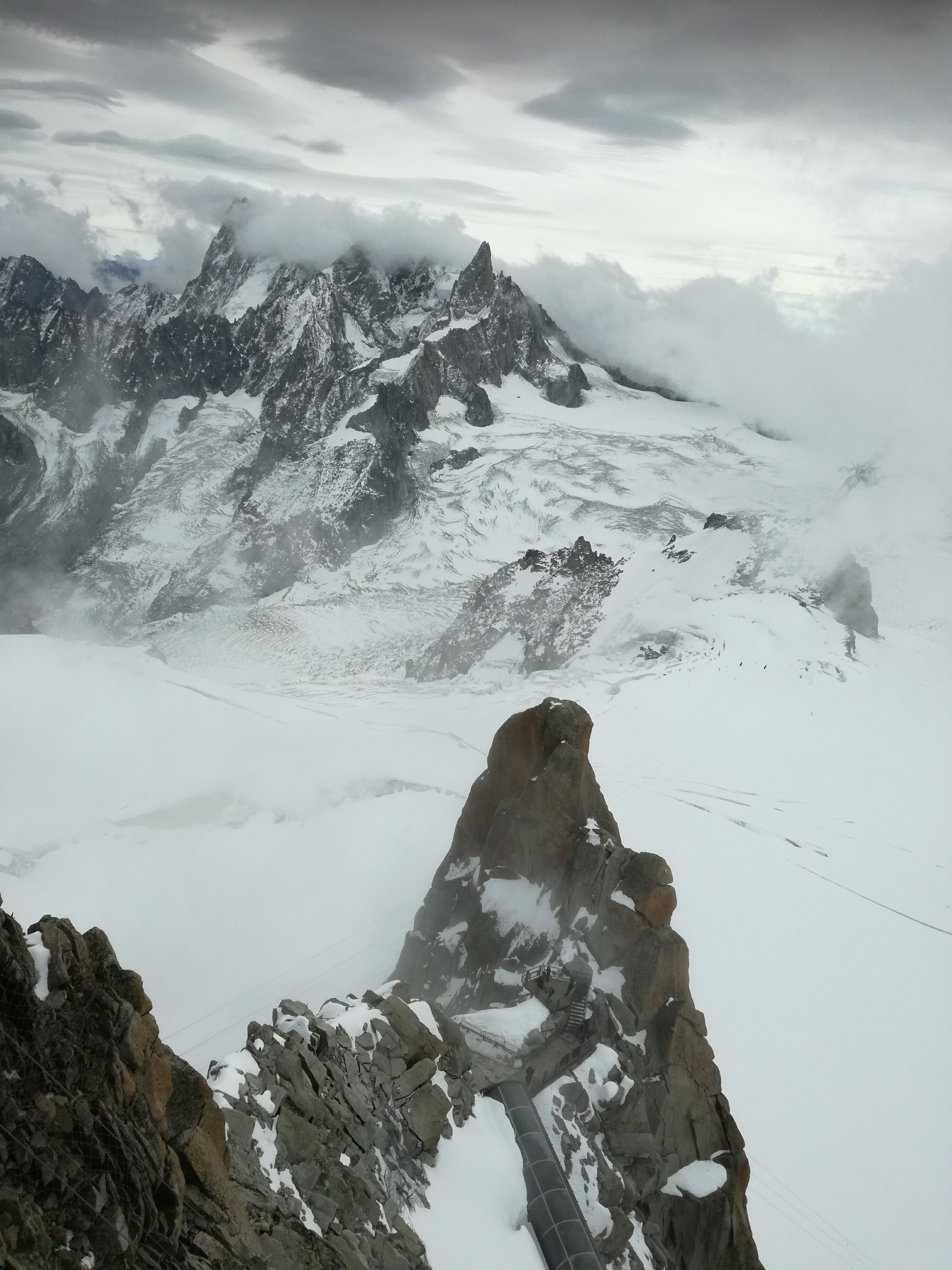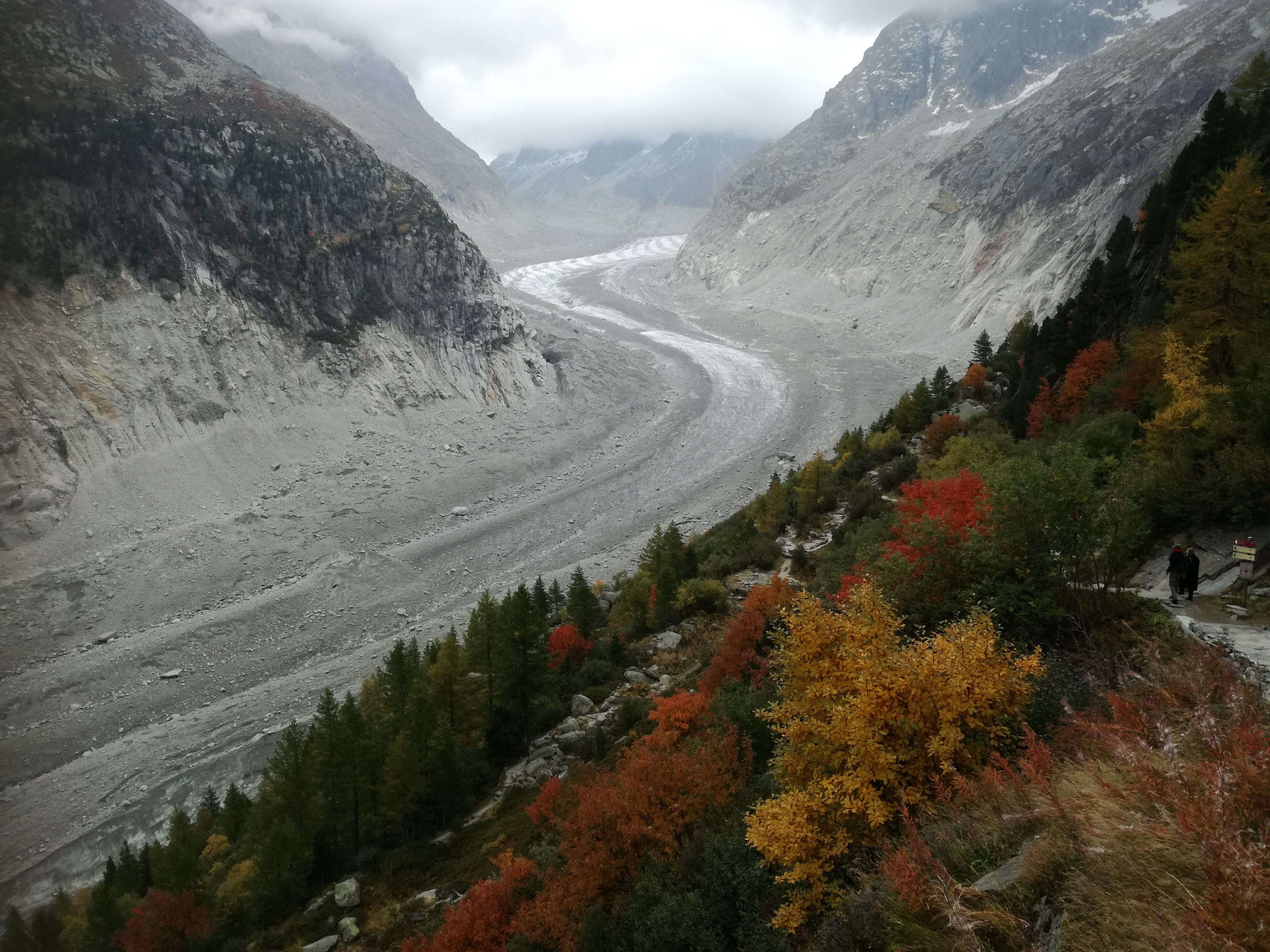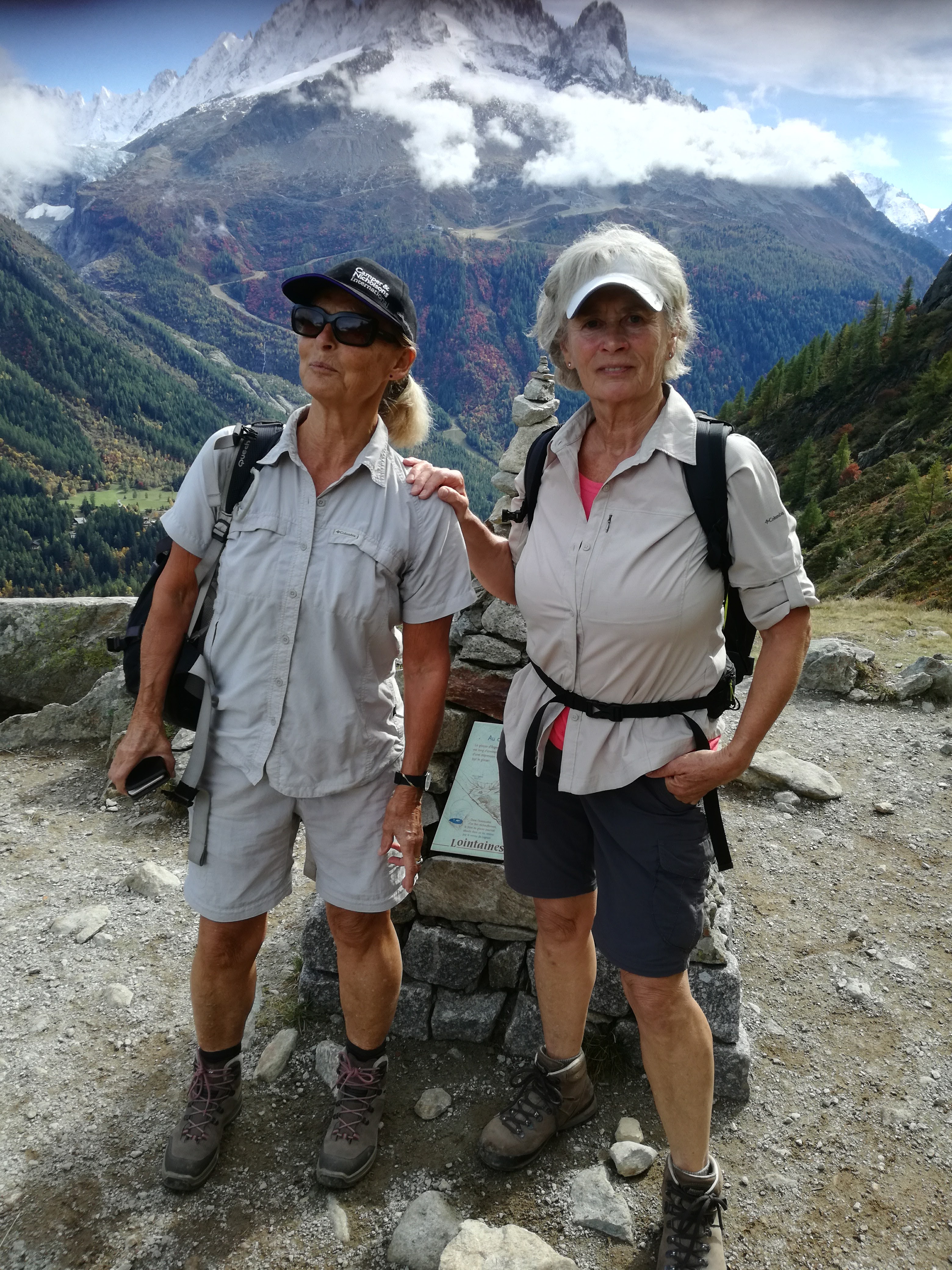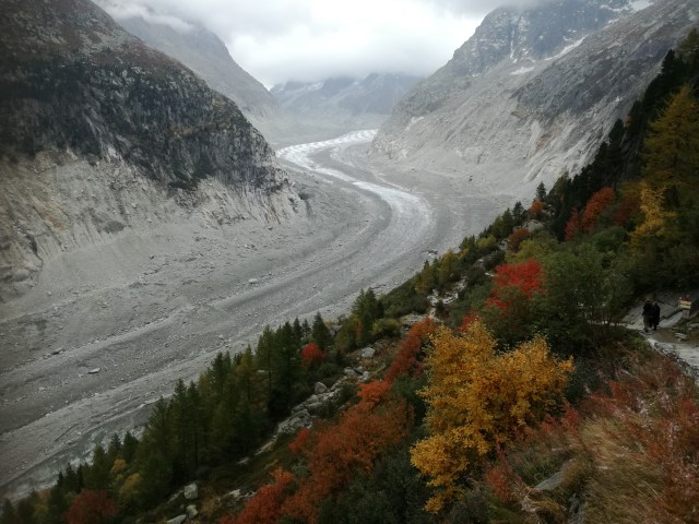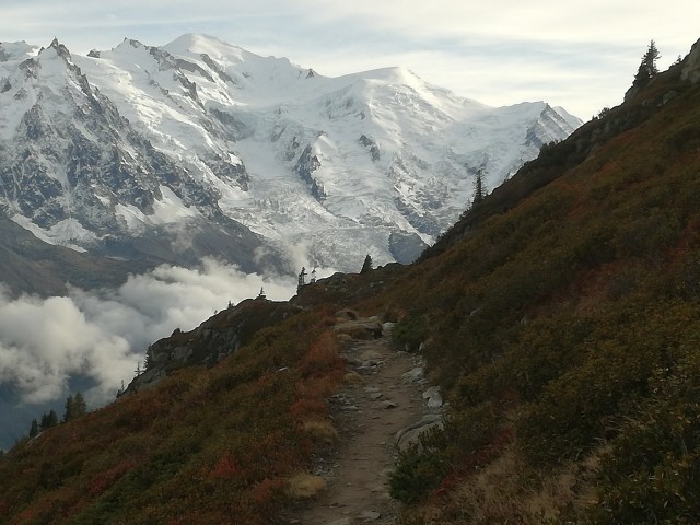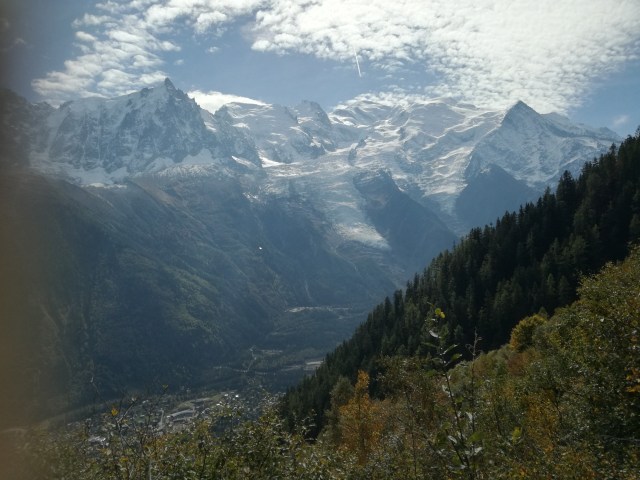 Aan de voet van de Mont Blanc in de Haute Savoie ligt Chamonix. Een bekend skioord, maar in de herfst is dit gebied minstens zo mooi. Groene, gele, rode tinten als contrast tegen de gletsjers en witte sneeuwtoppen. Prachtig; en lekker rustig, want het zomerseizoen is voorbij en de wintergasten komen pas in december. Ik was een paar dagen op pad met Zweedse Lena, die ik ken van de Via Francigena. We logeerden in het huis van haar dochter in Les Bossons. Geweldige lokatie. We hadden geluk met het weer: we konden in korte broek de bergen op. Dat hebben we dan ook uitputtend gedaan. We deden alsof 1000 m klimmen en dalen niets is! Steil omhoog en omlaag,met alsmaar wisselende vergezichten al dan niet in de wolken. Puur genieten. Omdat ik er toch was ben ik ook met de téléphérique de Aiguille du Midi opgegaan naar 3842 m en met het aloude treintje Montenvers wezen kijken bij de gletsjer Mer de Glace. Op foto’s kon je daar heel goed zien hoever deze gletsjer de afgelopen 100 jaar is teruggetrokken: dat is het effect van klimaatverandering. Dit jaar heb ik gletsjers gezien in Patagonie en Mongolie en nu hier. Mij lijkt dat deze gletsjer het snelst aan het terugtrekken is.
