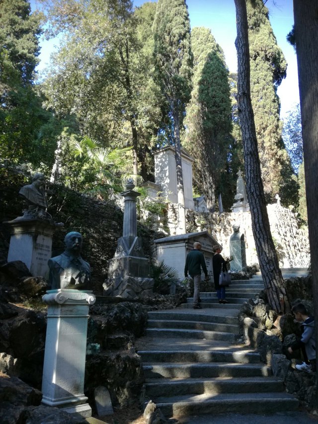 Allerheiligen, 1 november, blijkt in Italie een feestdag te zijn. Alles is dicht. Goede reden om de fameuze begraafplaats Staglieno te bezoeken. Ik ben niet de enige. De bloemenverkopers doen goede zaken deze dag. Het heeft wat weg van het Parijse Pere Lachaise, maar het is groter en heeft minder bekende namen. Hier liggen ontelbare graven; als terrassen tegen de steile hellingen op. Sereen in het groen, hoog boven de stad.