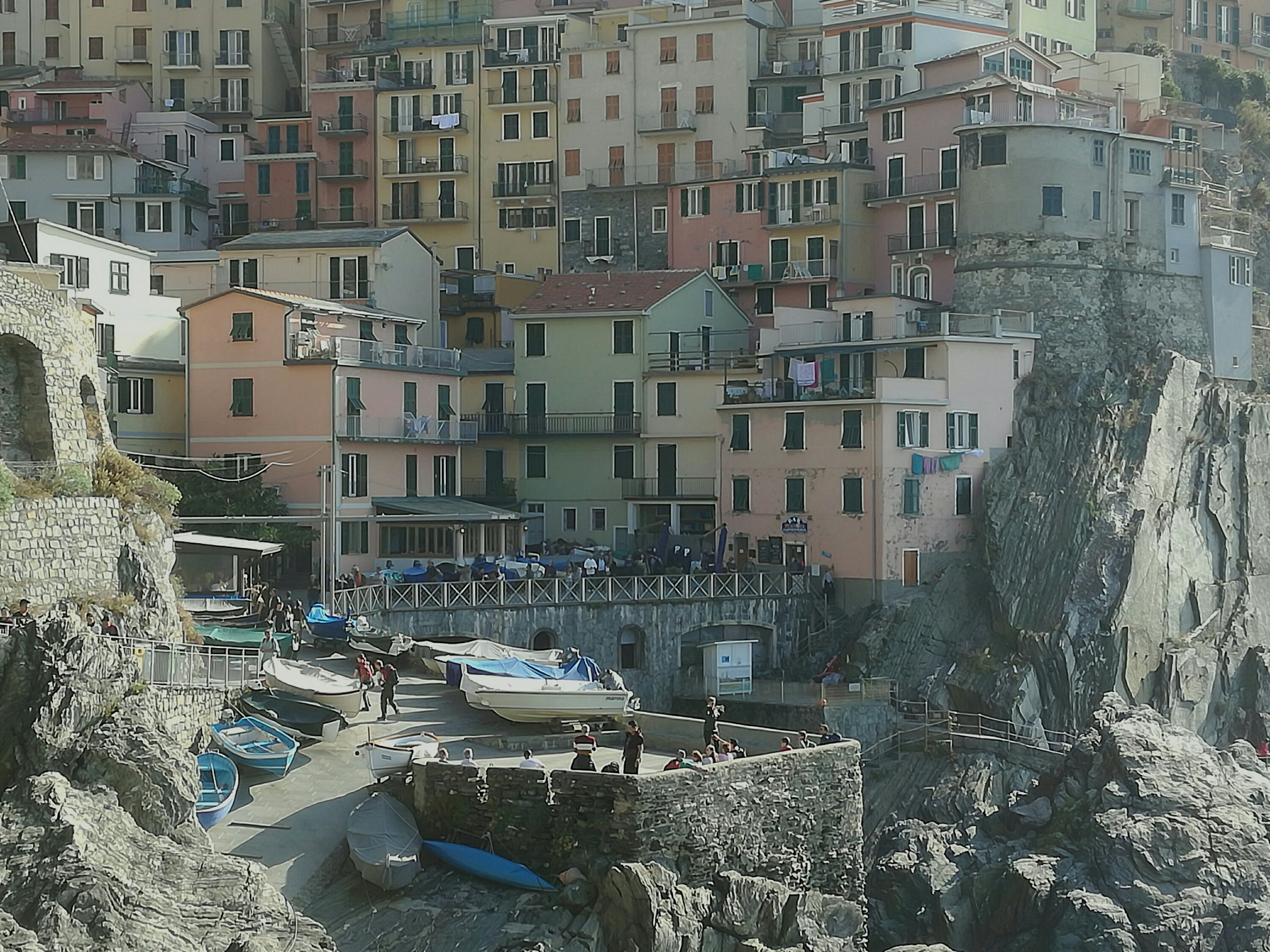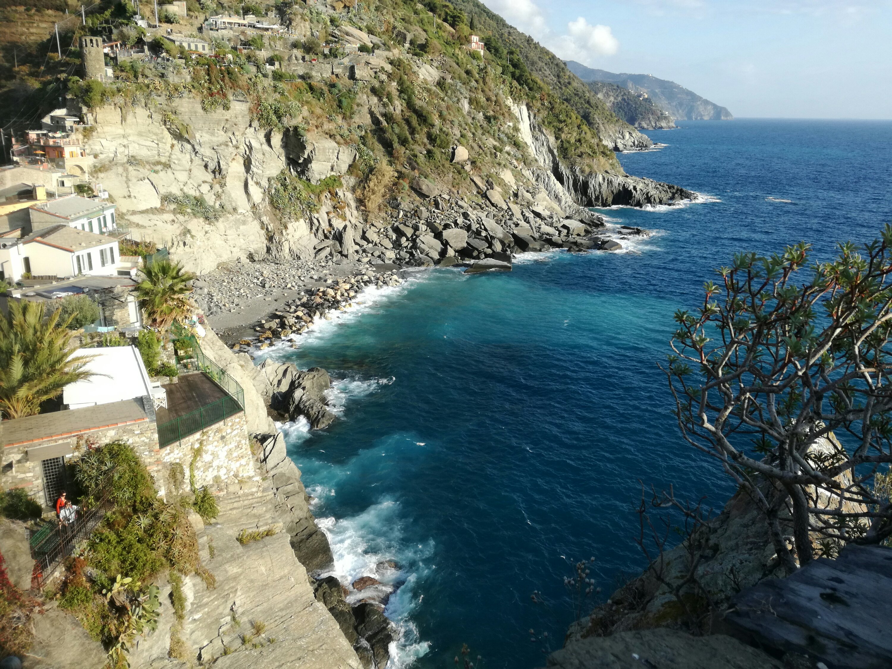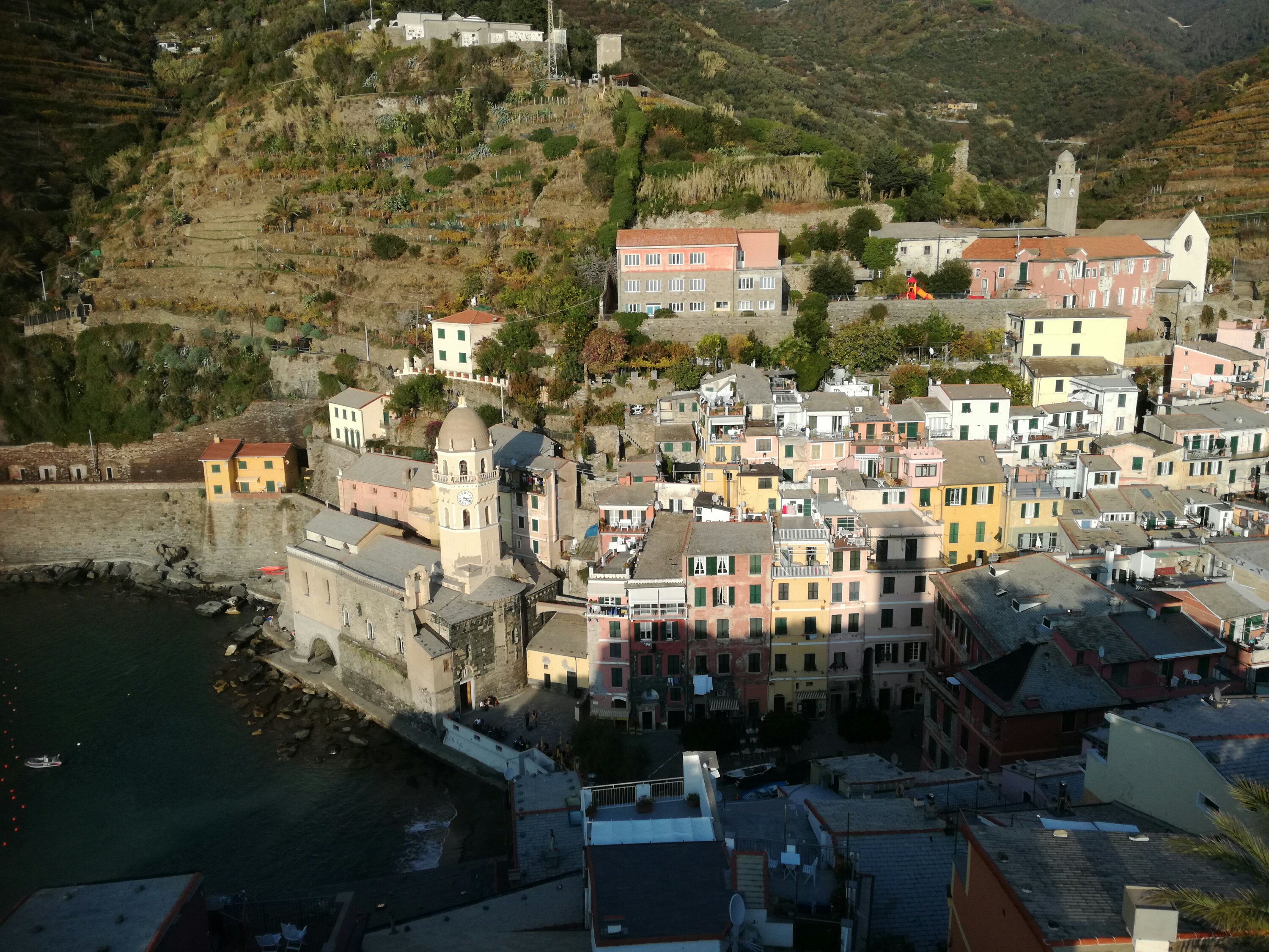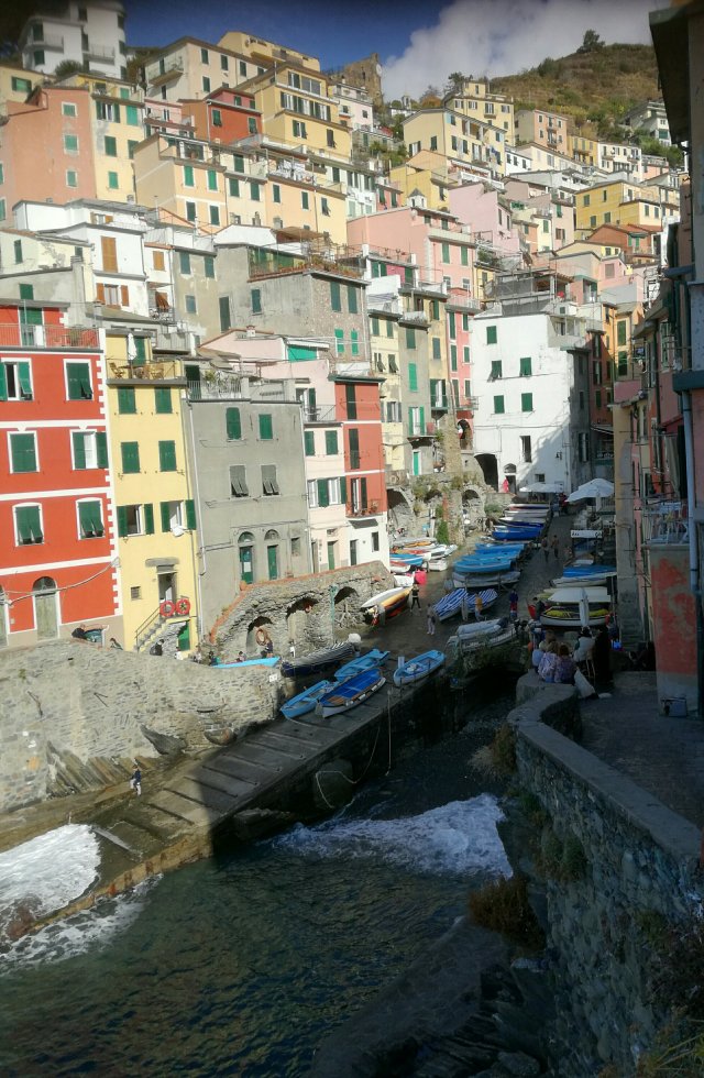 Cinque Terre: 5 schilderachtige dorpjes tegen steile rotswanden. Bovenop de rotsen loopt een wandelpad, wat op mijn verlanglijstje stond. Een deel ervan, de Via dell’Amore tussen Manarolo en Comiglia, is sinds een aardverschuiving in 2012 echter afgesloten. De alternatieve afstand is aanzienlijk langer geworden. Ik heb enorm zitten puzzelen of ik de gehele route vanaf Monteroso zou kunnen halen in 1 dag. Eerst vanuit Genua 2 uur met de trein en dan zeker 7 uur lopen zonder pauze. Nadat ik eenmaal in Riomaggiore was aangekomen (half 11) en me door een overweldigende massa toeristen gewurmd had, had ik snel door dat het geen haalbaar plan was. Vooral omdat het al zo vroeg donker is. Het kost immers ook tijd om alle plaatsjes stuk voor stuk te bekijken. Het een is al kleurrijker dan het ander en ik wilde er niet een missen. Het werd een betoverende dag, maar ook een race tegen de klok.