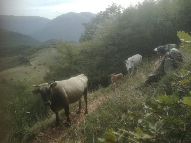 Een grote kudde koeien deed ons tegen de helling opkruipen, om ze schichtig te laten passeren zonder dat hun kalfjes het ravijn in schoven.