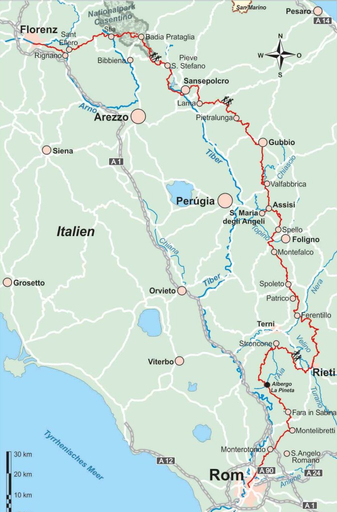 In 2016 ben ik begonnen met deze tocht in de voetsporen van Franciscus van Assisi. Dat jaar ben ik gekomen tot Spoleto. Het is een prachtige route en het mooiste deel komt zelfs nog. Tussen Spoleto en Rome liggen nog een aantal Franciscaanse kloosters, die allemaal een bezoek waard zijn. Ik ga dit keer op pad met neef Johan, die zo’n pelgrimstocht ook wel eens wil meemaken. Het belooft veel klimmen en dalen te worden met prachtige uitzichten. We hebben er 2 weken voor uit getrokken. Ter voorbereiding hebben we in de zomer enige heuveltraining gedaan in het Christelijke Limburg ……