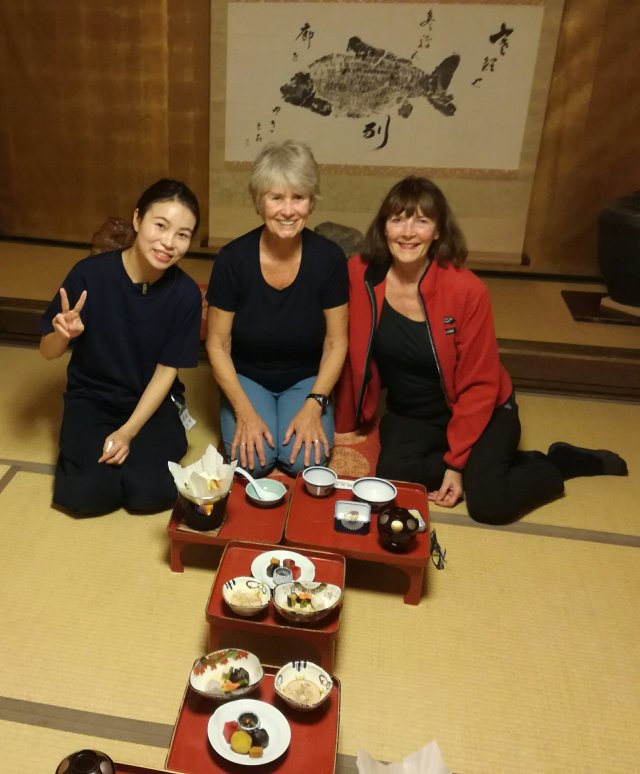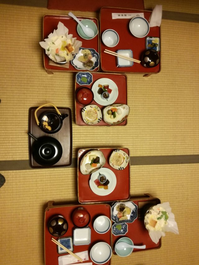 We kregen het eten opgediend op onze kamer op kleine lage tafeltjes op de tatami-matten vloer. Alles ziet er heel smaakvol uit en dat is het ook. Het is vegetarisch en het is heel uitgebalanceerd samengesteld uit 5 smaken en 5 kleuren.