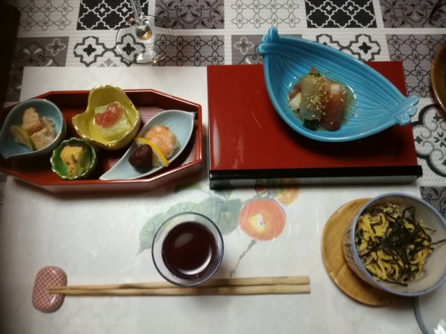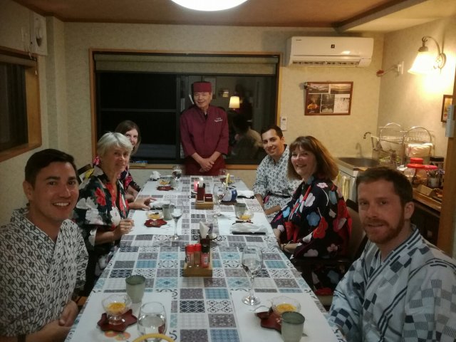 Een keer logeerden we in een minshuku van een Japanse meesterkok. Er waren nog 4 andere gasten. Door de gastvrouw werden we voor het eten in een echte kimono gehesen.