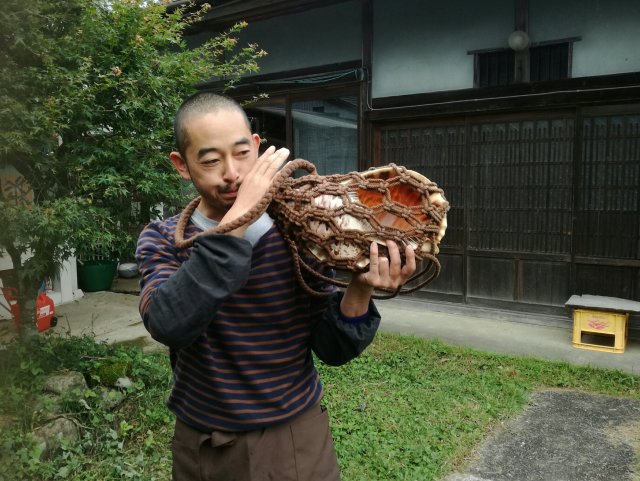 Het enige waar wij niet zo dol op zijn zijn stukken tofu. Ook boekweitproducten vallen minder in de smaak bij ons. In een andere minshuku bleek de eigenaar daarin juist gespecialiseerd te zijn. Ter verwelkoming en bij afscheid blies hij op de schelp.