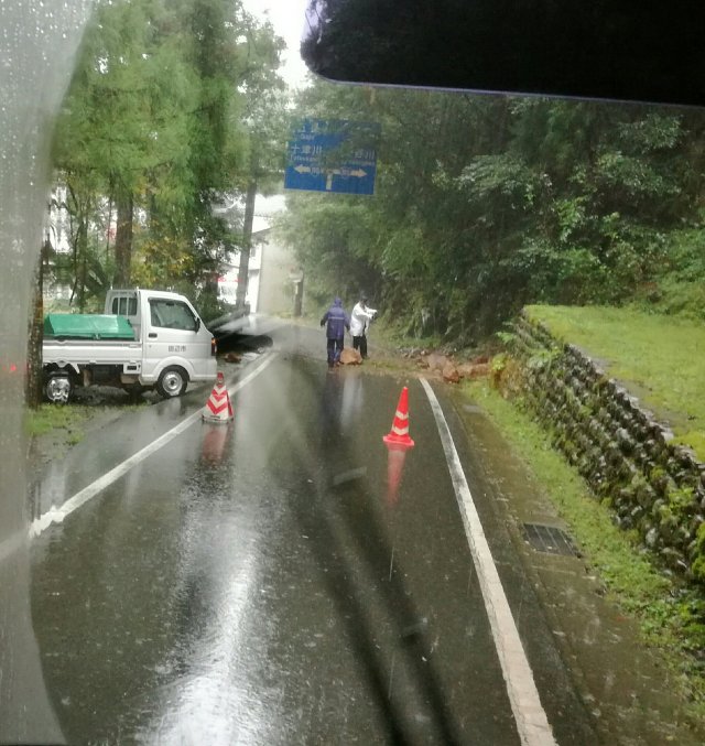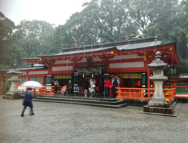 Onze plannen moeten we een beetje aanpassen, want het water komt met bakken uit de hemel. Zonde van onze tijd maar we kunnen niet anders dan ons erbij neerleggen. Desondanks hebben we met de bus het fraaie tempelcomplex bezocht in Shingu. Op een gegeven moment zei de buschauffeur dat we allemaal met de benen omhoog moesten! Er stond meer dan een halve meter water op de weg.