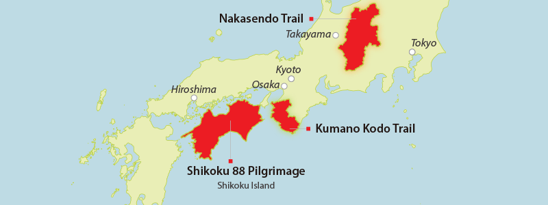 Het voorstel om dit te gaan doen kwam van Agnes die ik ken van een Birmareis in 2011. Dat liet ik mij geen 2 keer zeggen. Het is een route waar ik al eens eerder over gehoord en nagedacht had. Dat het er nu pas van komt heeft te maken met de seizoenen. We kozen voor de herfst met zijn prachtige goudgele en rode kleuren. Het pad wat wij gaan lopen heet het Kumano Kodo Nakahechipad (roze kleur in het kaartje hierboven). Dit pad gaat door prachtige bossen; over stenige paden met mossige trappen; over bergen en langs watervallen. Onderweg zijn er belangrijke Boedhistiese tempels en Shinto heiligdommen uit ver vervlogen tijden. We slapen in traditioneel Japanse Ryokans en Minshukus en badderen in Onsen (minerale heetwaterbronnen).