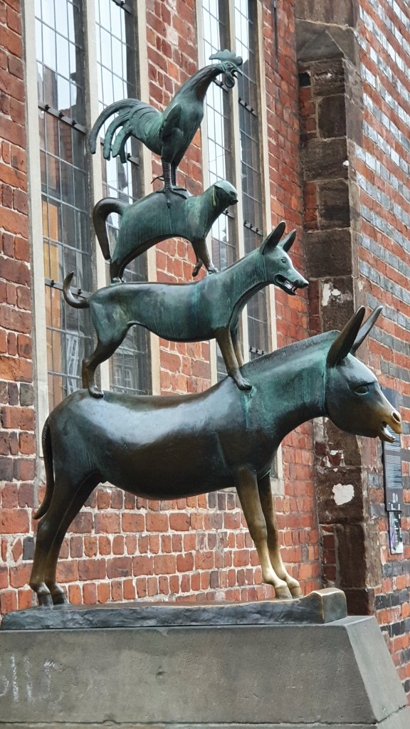 Bekend is ook de iconische beeltenis van de ‘muzikanten’: een ezel met daarbovenop een hond, een kat, en een haan.