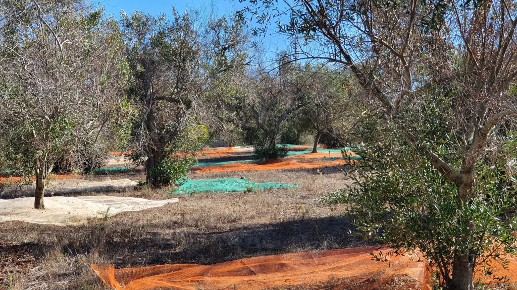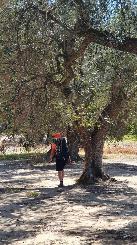 We liepen eindeloos tussen de olijfbomen, die kennelijk onderhand geoogst worden. We zagen netten in allerlei kleuren verschijnen om de gevallen olijven te verzamelen.