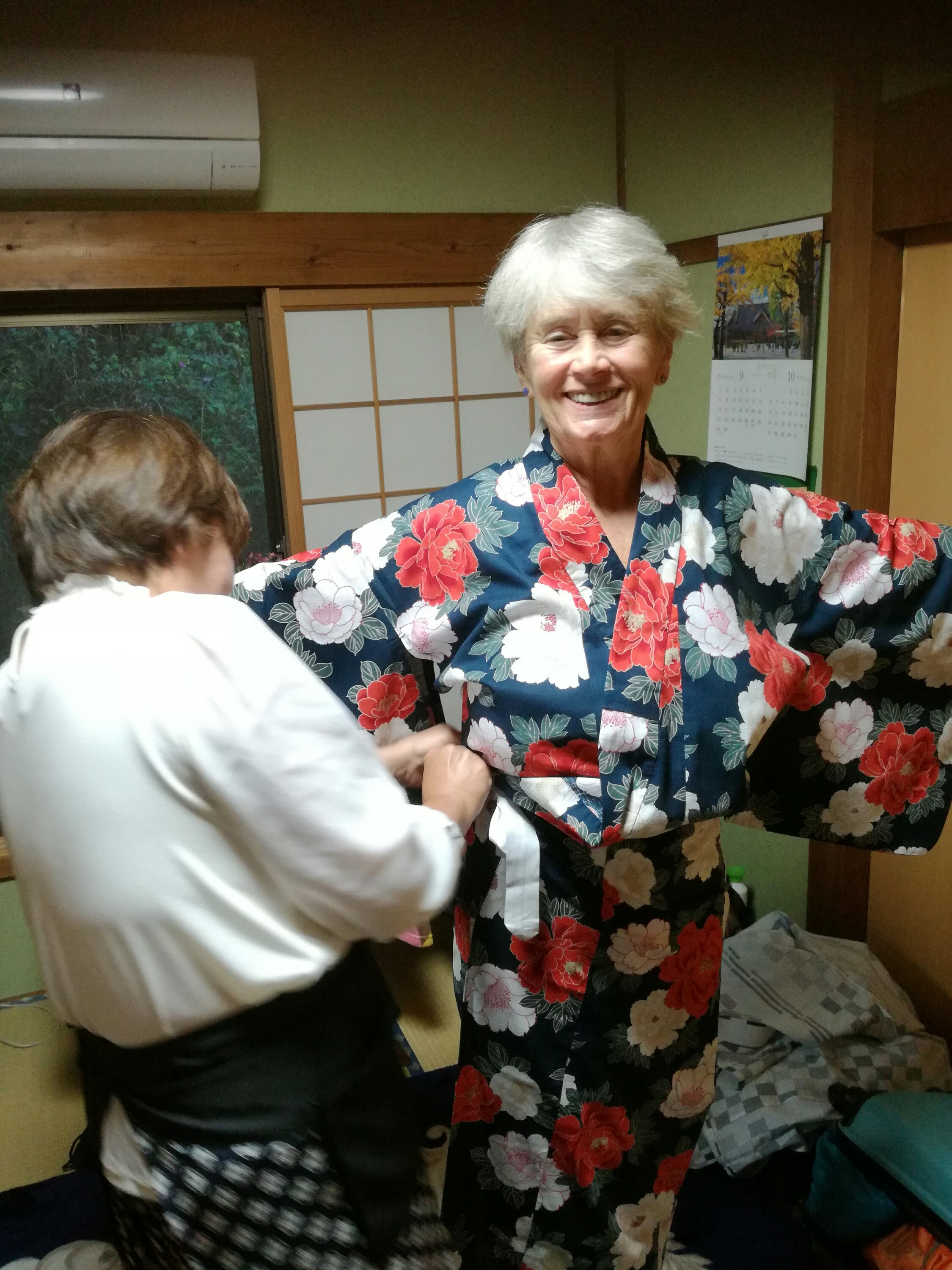 Een keer logeerden we in een minshuku van een Japanse meesterkok. Er waren nog 4 andere gasten. Door de gastvrouw werden we voor het eten in een echte kimono gehesen.